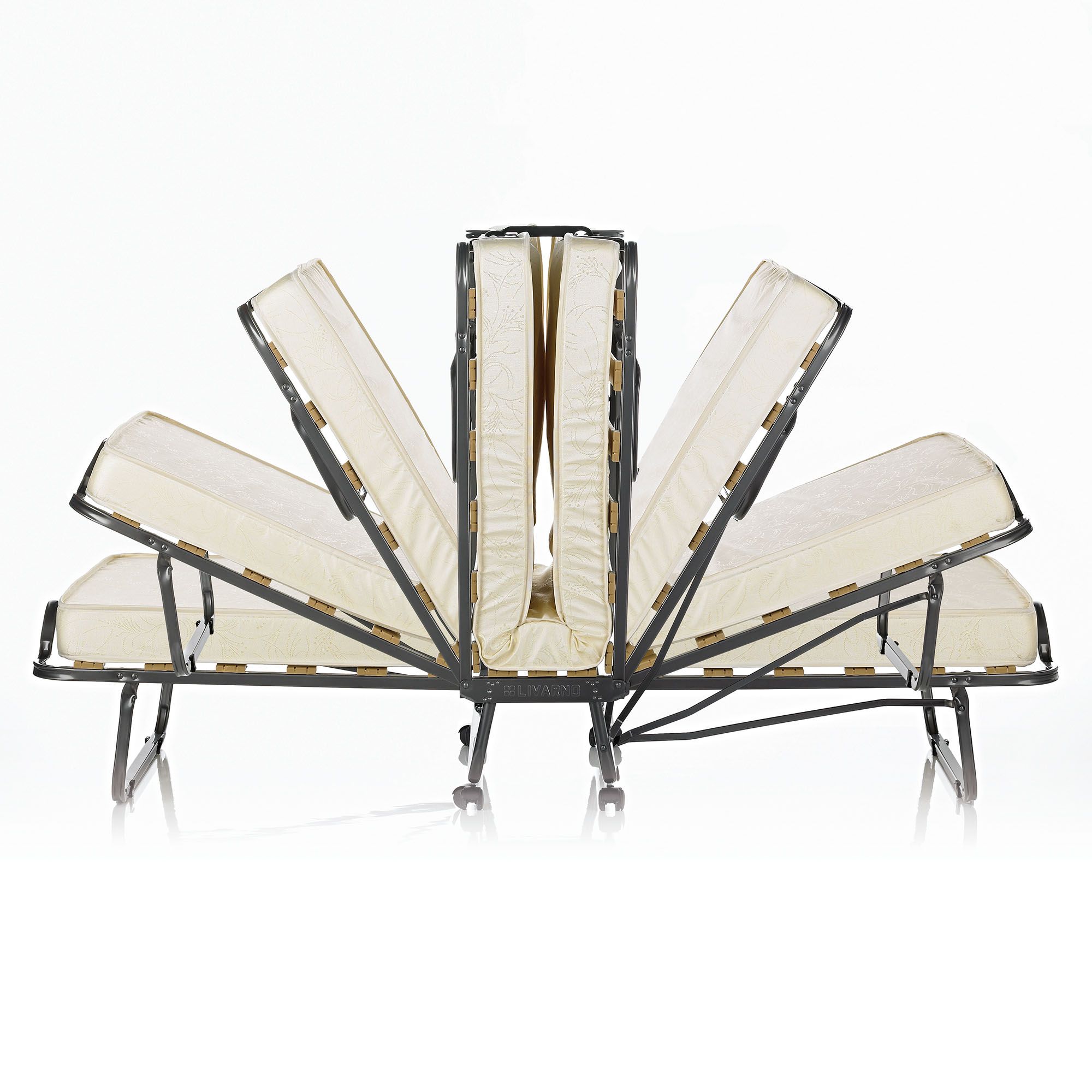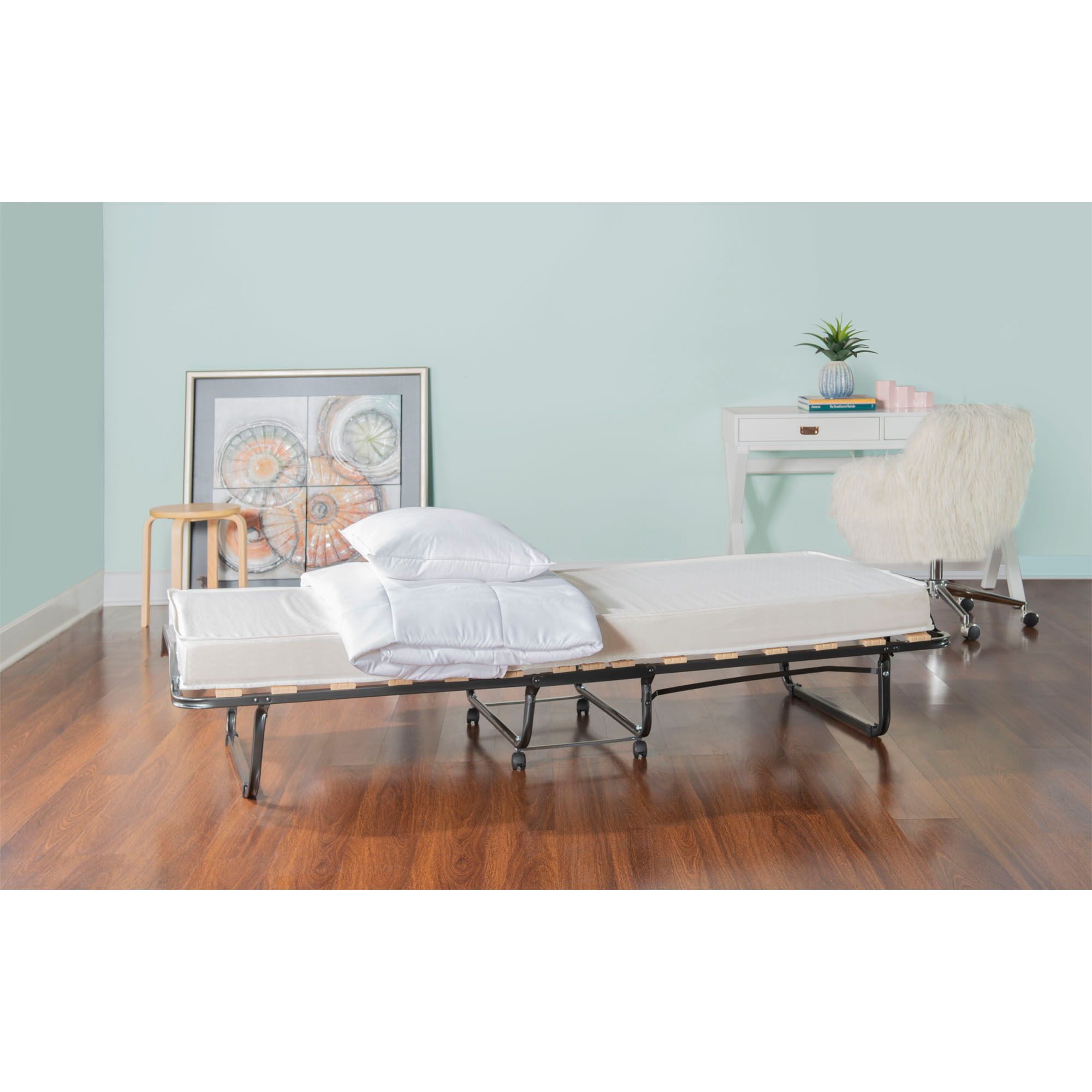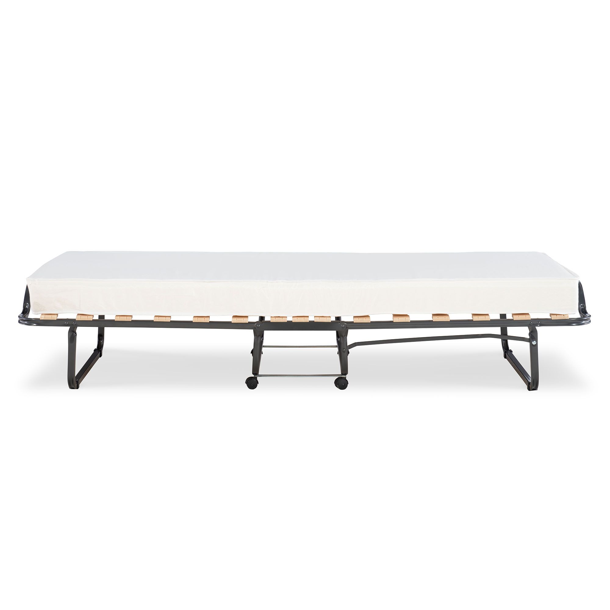 Frame is made of steel tubing with durable wood slats Comes with a memory foam-topped, twin-size mattress Soft, beige damask fabric cover Compact design allows easy setup and storage Integrated transport casters Assembly required Includes folding bed and twin-sized mattress topped with memory foam Warranty: 30 days limited