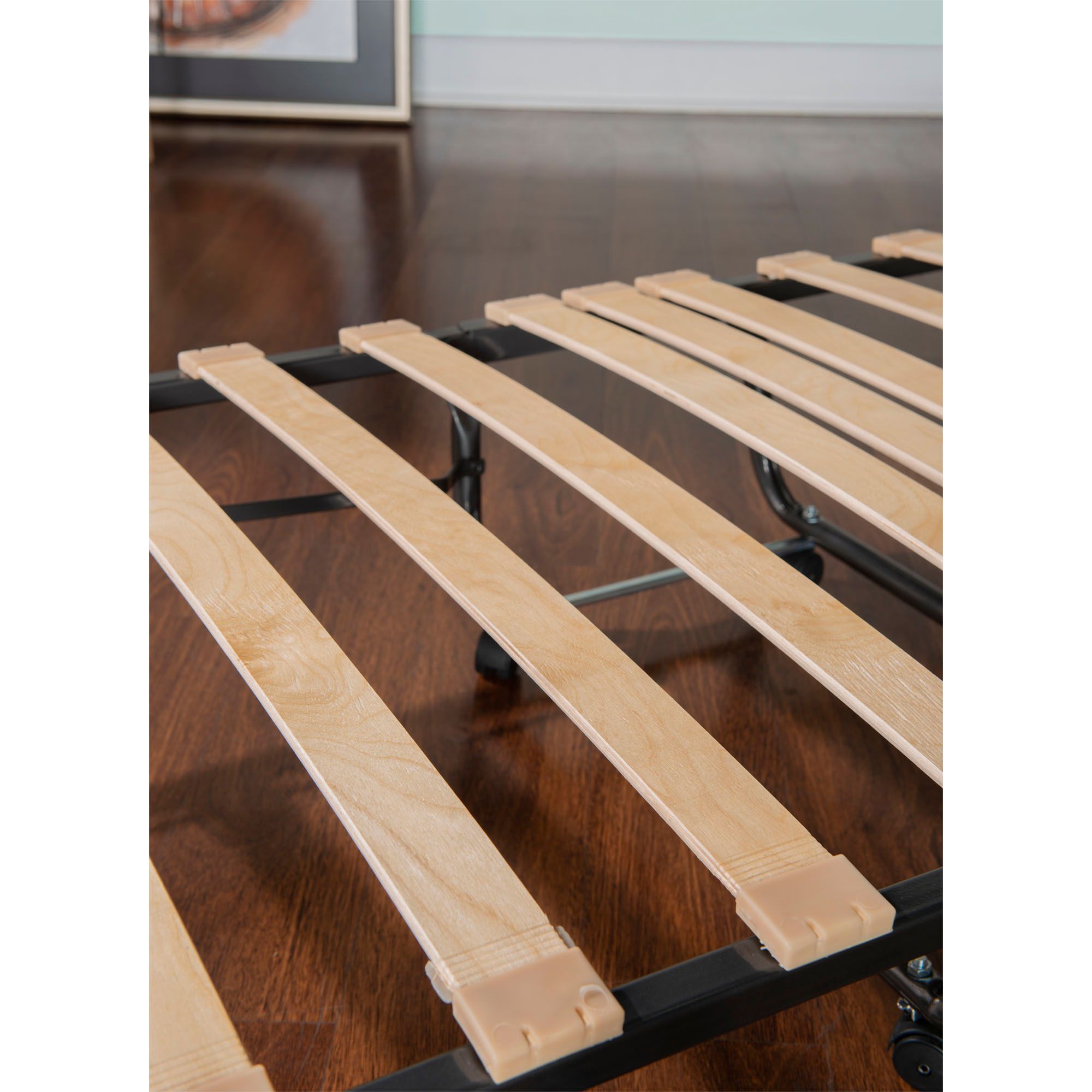 Welcome your next houseguest with a comfortable night's rest upon the Jacoby Folding Bed. Thanks to its simple, folding design, the bed is easy to assemble and stow away in a closet when it's not in use. Plus, its built with tough steel tubing and wooden slats to support the included mattress, which is topped with luxurious memory foam.
