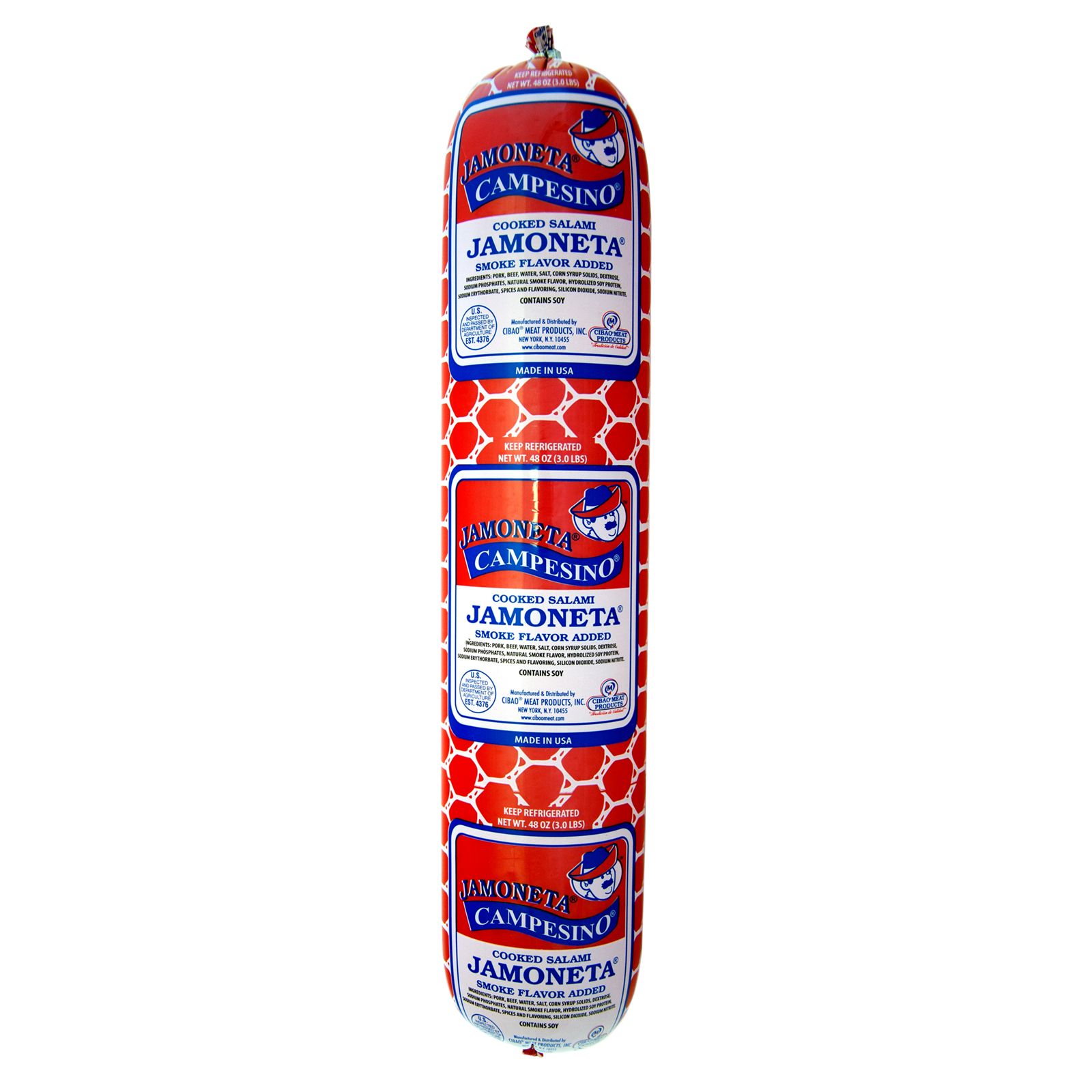 Jamoneta Campesino is a Hispanic Style Luncheon Loaf made with Pork and Beef. This unique loaf is seasoned, and smoke flavor added to give it that distinguished taste that Hispanics aspire for. The meat is ground very fine thus giving it a similar texture found in American type luncheon loaves. This salami can be served in serval different ways. Being that it is a ready-to-eat item you can cut it up straight out of the casing. Enjoy with something as simple and easy as cheese and crackers, a nice breakfast dish served along eggs, and any other dish you can think of needing that perfect sausage complement.