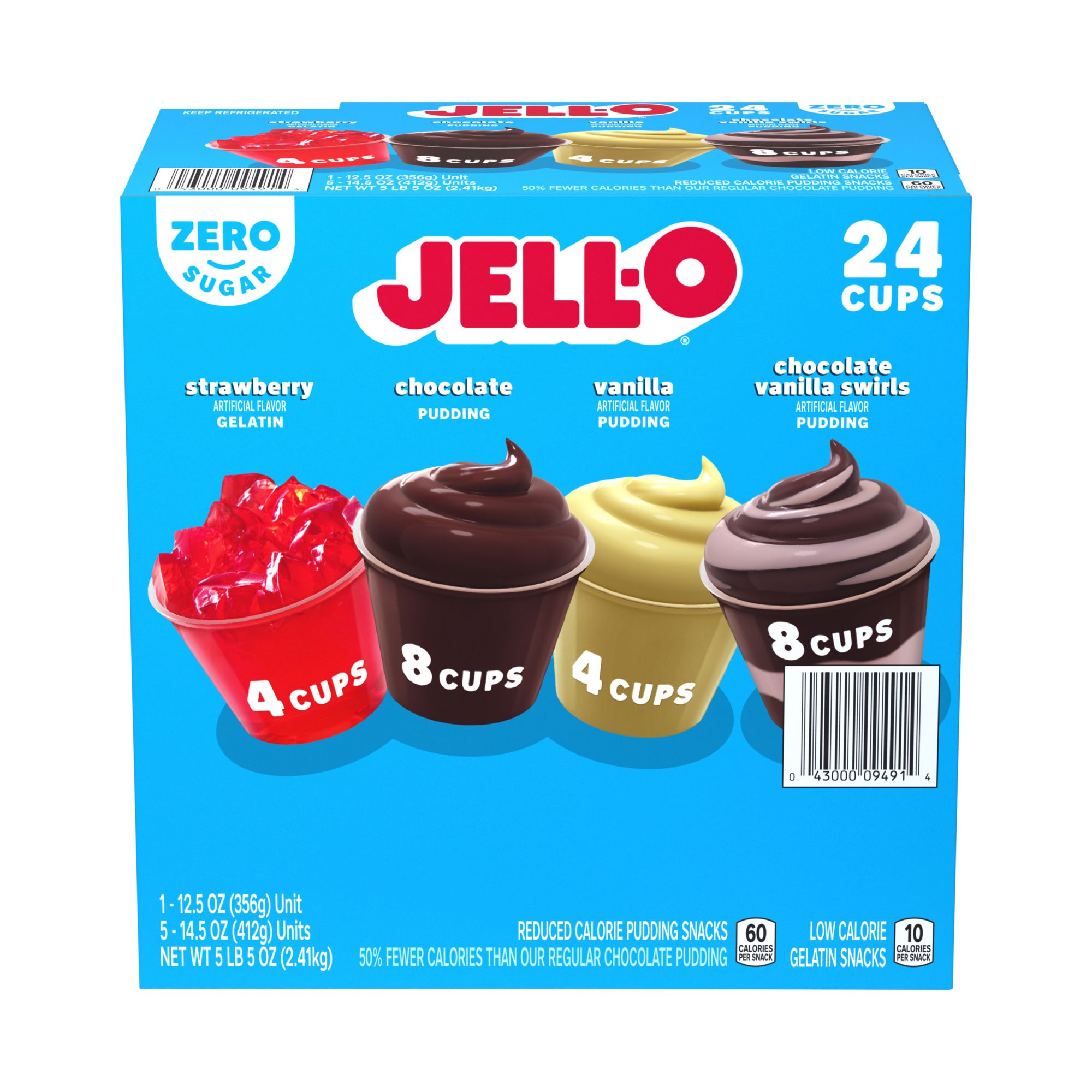 Jell-O Sugar Free Gelatin and Pudding Refrigerated Variety Pack features a 24-count of variety pudding and gelatin packs. Perfect for school lunches, work breaks, and snacking at home, this variety pack contain 8 Chocolate, 4 Vanilla, and 8 Vanilla Swirl pudding cups, along with 4 strawberry gelatin cups. These sugar free snacks contain no artificial preservatives, and the pudding snacks are a good source of calcium. Each snack cup in this variety pack of pudding and gelatin is individually sealed for freshness.
