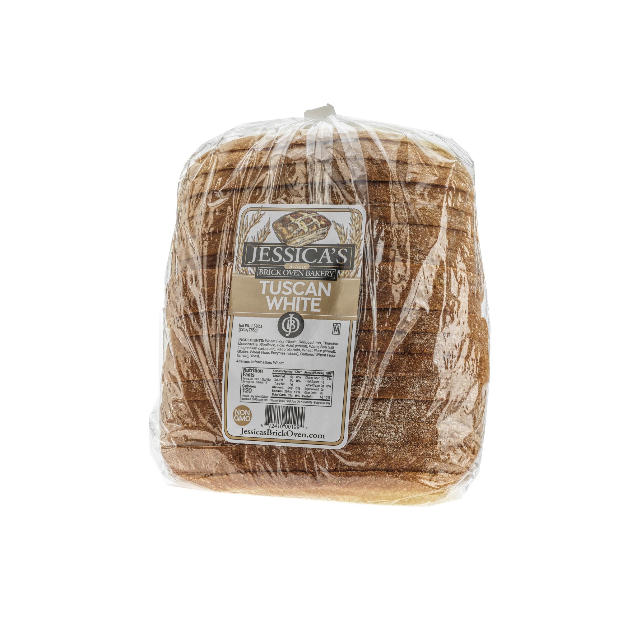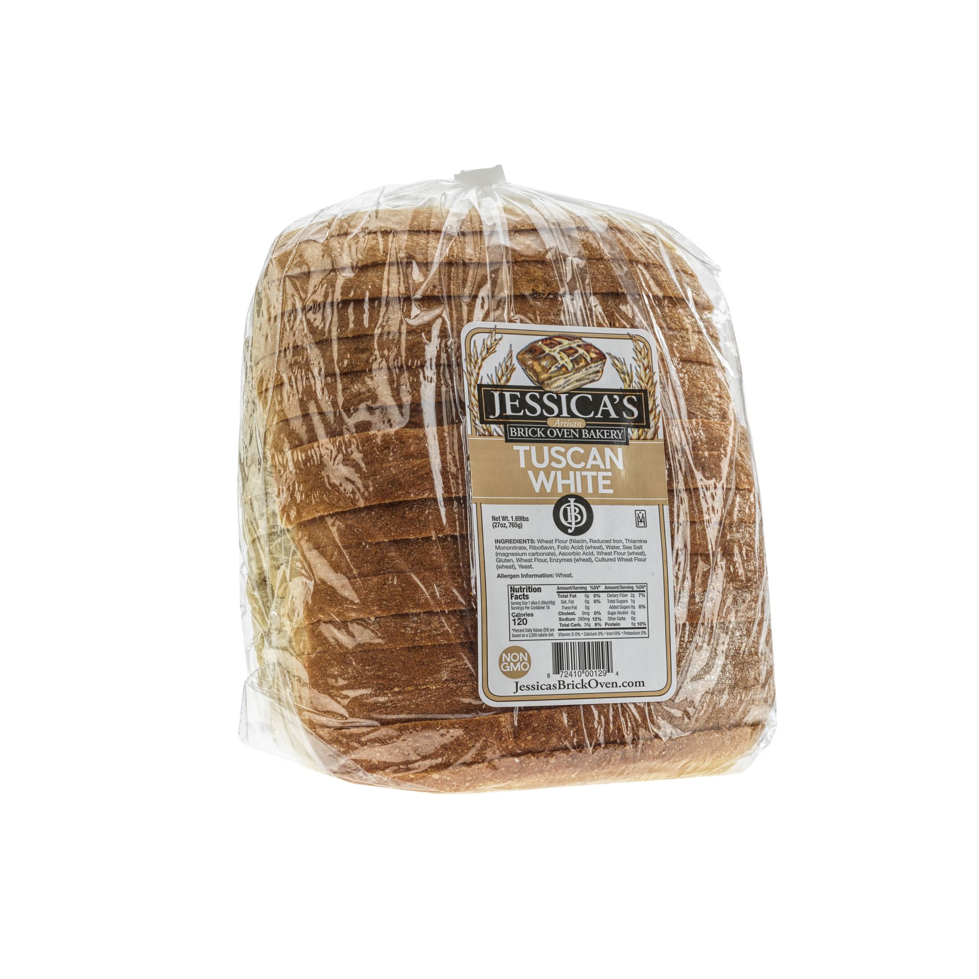 Jessica's Tuscan's are uniquely shaped and sliced breads with a soft, slightly open crumb and chewy artisan crust. Jessica's Brick Oven's secret blend of 100% all natural starters give their pane its chewy center and unique sourdough taste. This bread is pre-sliced for the customer for ease of use once purchased.