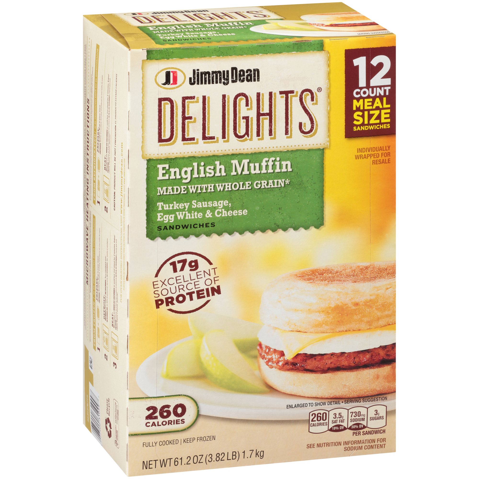 Give more power to your mornings with Jimmy Dean Delights English Muffin Sandwiches. Savory turkey sausage, fluffy egg whites, and real cheese come together on a toasty English muffin made with whole grains for a delicious, portable breakfast at home or on-the-go. With 17 grams of protein and just 250 calories per serving, our Turkey Sausage, Egg White & Cheese English Muffin Sandwiches are the perfect protein-packed option to lighten up your breakfast routine.