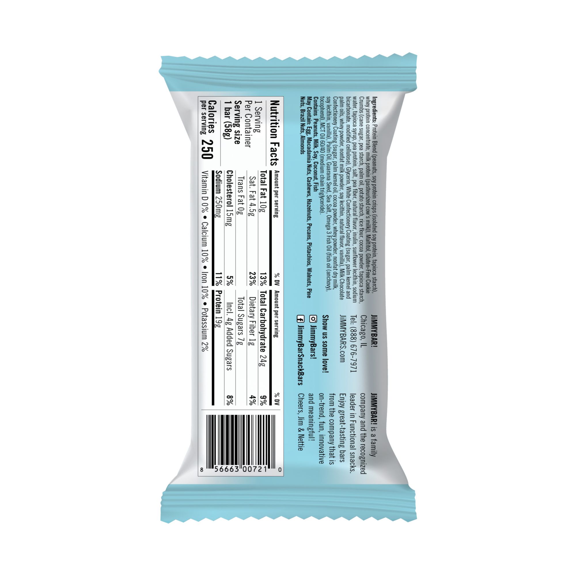 Ingredients: Protein Blend (soy protein crisps* (soy protein isolate*, tapioca starch) peanuts, whey protein), Maltitol, Gluten-Free Cookies (sugar, rice flour, palm oil, corn starch, oat flour, cocoa, contains 2% or less of: potato starch, xanthin gum, molasses, sodium bicarbonate, ammonium bicarbonate), White Chocolate Coating (palm kernel oil, milk, soy lecithin), Vegetable Glycerin, Palm Oil^, Chocolate Coating (vanillin), Natural Flavor, Guarana, Sea Salt, MCT Oil, Omega 3 Oil *Non-GMO ^Sustainably Sourced.