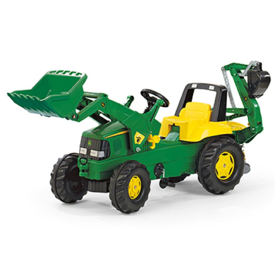 Fully-functional Backhoe Digger with stabilizer foot and safety latch Fully-functional front loader Two position adjustable seat to grow with your child Oversized resin tires with long lasting rubberized tread strip High impact blow molded resin body for superb style and durability Fully-enclosed chain drive system with external adjustment Manufactured by Rolly Toys Ages 3+ Includes pedal tractor, backhoe attachment Warranty: 3 years limited