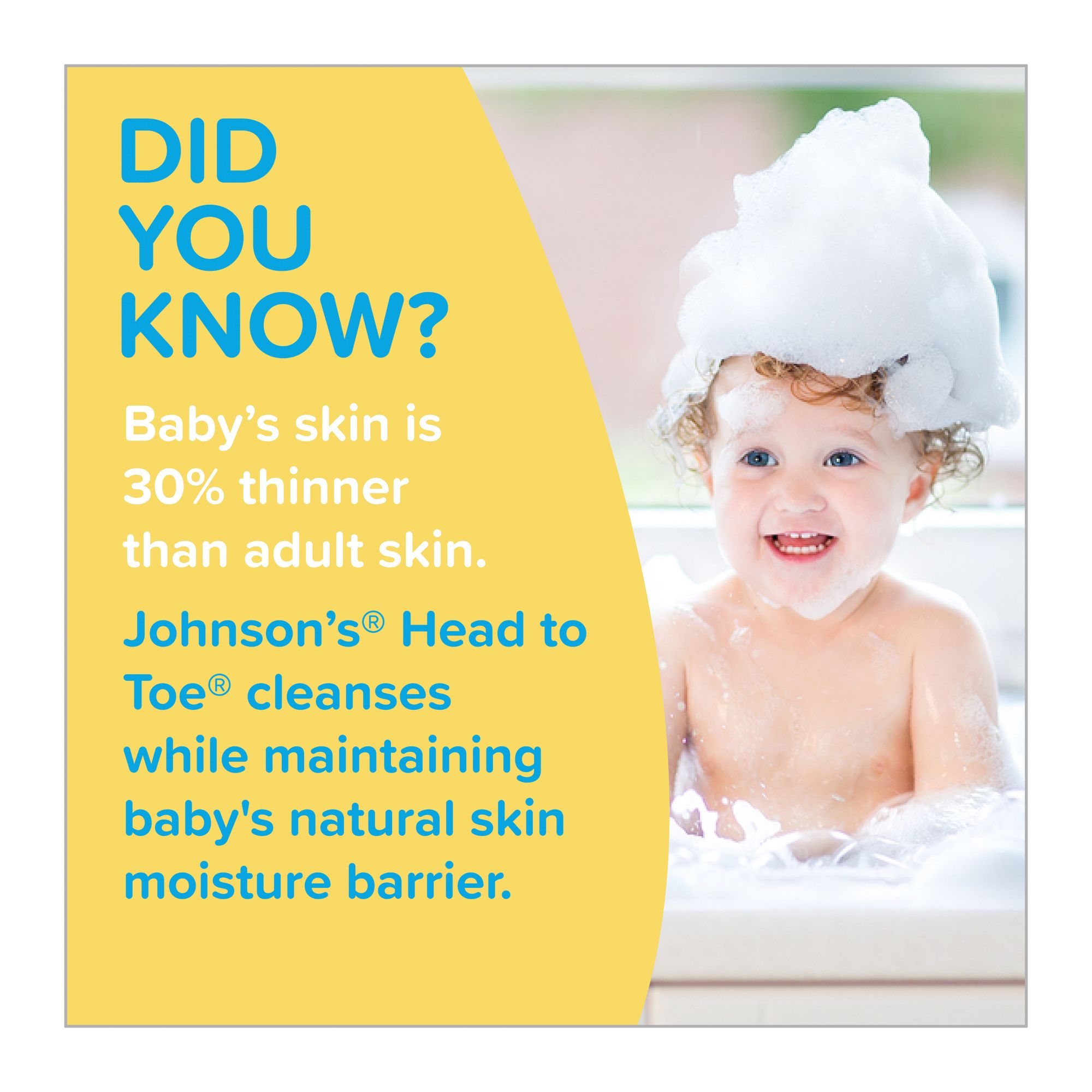 Gentle enough for newborns and good for the whole family, Johnson's Head-To-Toe Baby Wash & Shampoo helps make bath time bonding time with your baby. The Johnson's No More Tears formula makes this baby wash tear-free and as gentle to your baby's eyes as pure water. Based on the average cumulative volume of ingredients in Johnson's Head-To-Toe wash & shampoo, using ISO DIS 16128 (water included).