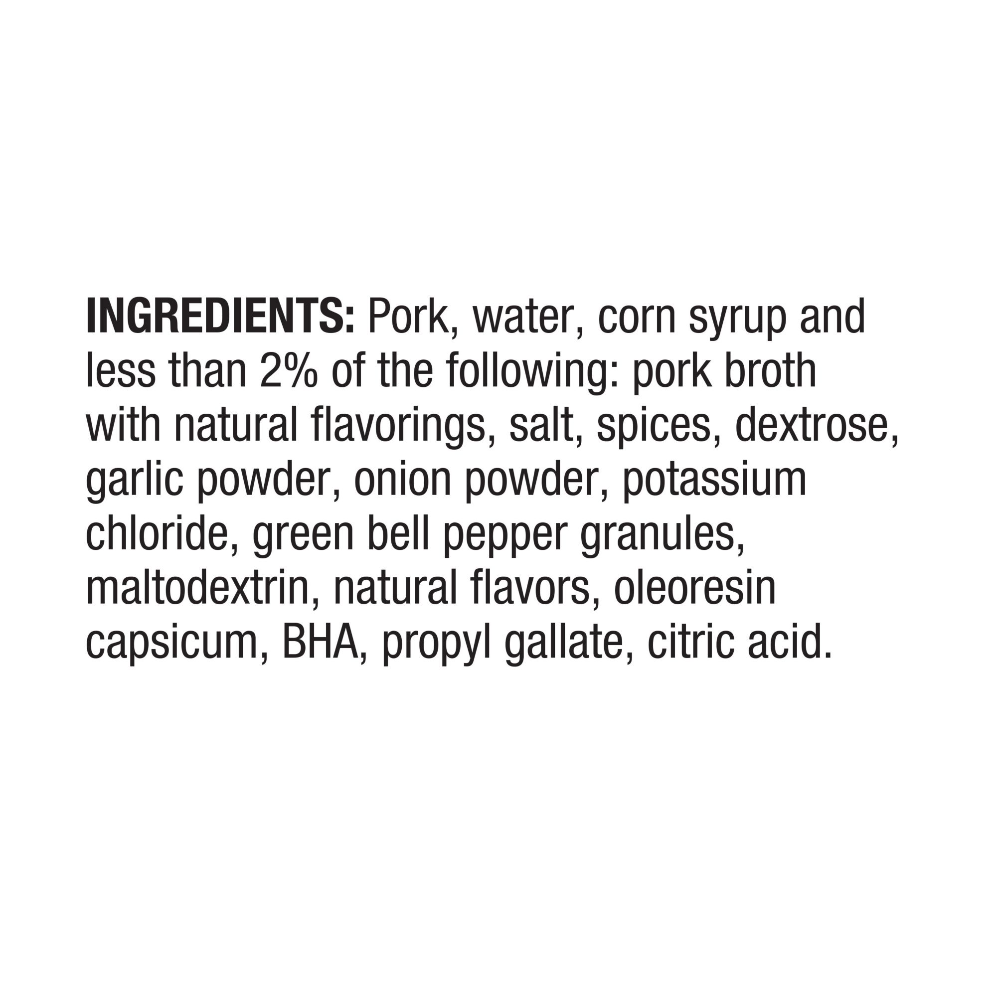 Pork, water, corn syrup and less than 2% of the following: pork broth with natural flavorings, salt, spices, dextrose, garlic powder, onion powder, potassium chloride, green bell pepper granules, maltodextrin, natural flavors, oleoresin capsicum,BHA, propyl gallate, citric acid>
