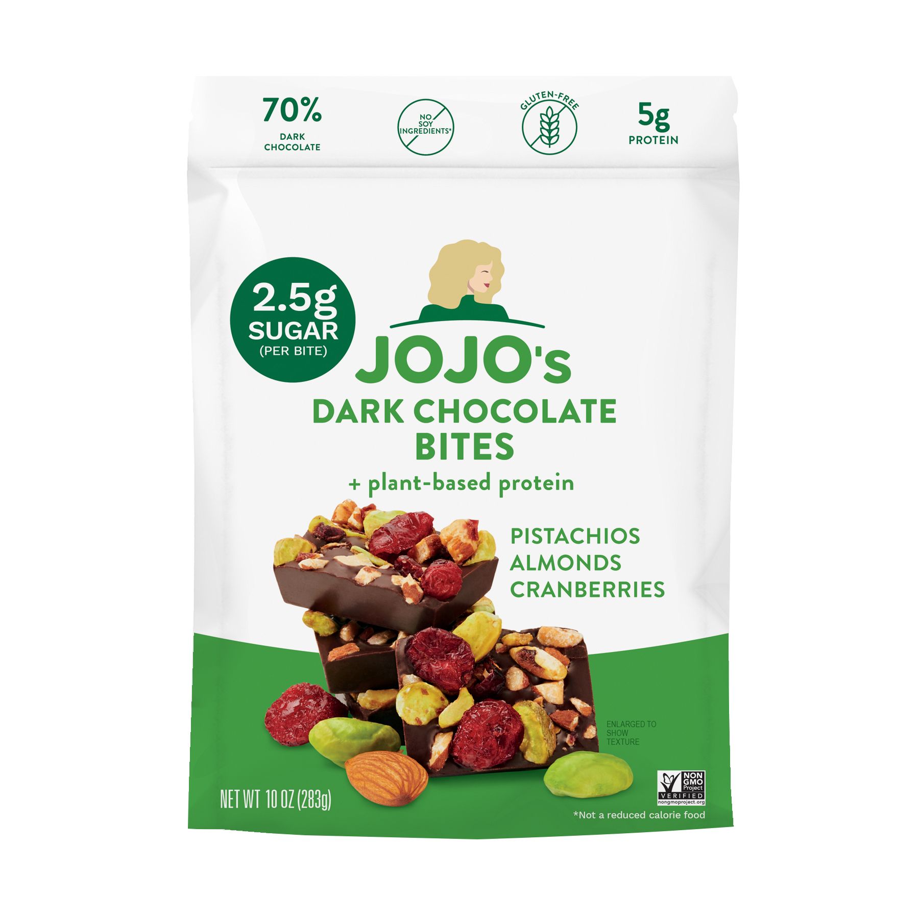 Made with 70% Dark Chocolate, Almonds, Pistachios, Dried Cranberries, and Hemp Protein 180 Calories per serving Always low-sugar and low carb JOJO's Dark Chocolate is so delicious you won't believe it's low-sugar Plant-based protein Certified Gluten Free, NON-GMO, Soy Free, Lactose Free, Paleo, Vegan & Keto Friendly