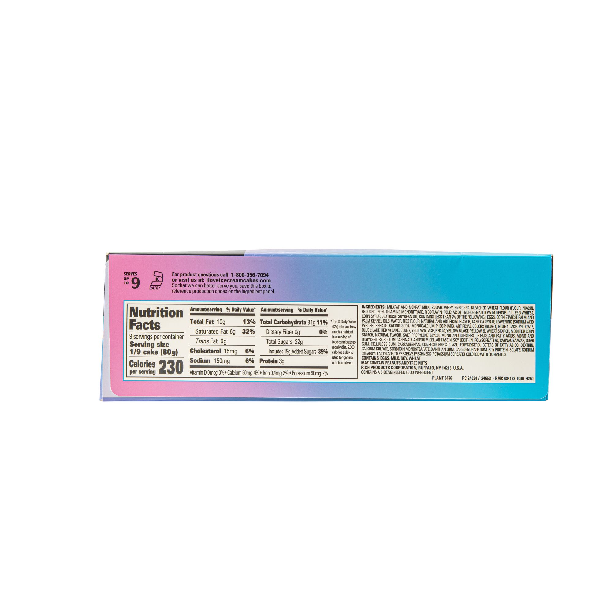 Ingredients: Milkfat And Nonfat Milk, Sugar, Whey, Enriched Bleached Wheat Flour (Flour, Niacin, Reduced Iron, Thiamine Mononitrate, Riboflavin, Folic Acid), Hydrogenated Palm Kernel Oil, Egg Whites, Corn Syrup, Dextrose, Soybean Oil, Contains Less Than 2% Of The Following: Eggs, Corn Starch, Palm And Palm Kernel Oils, Water, Rice Flour, Natural And Artificial Flavor, Tapioca Syrup, Leavening (Sodium Acid Pyrophosphate, Baking Soda, Monocalcium Phosphate), Artificial Colors (Blue 1, Blue 1 Lake, Yellow 5, Blue 2 Lake, Red 40 Lake, Blue 2, Yellow 5 Lake, Red 40, Yellow 6 Lake, Yellow 6), Wheat Starch, Modified Corn Starch, Natural Flavor, Salt, Propylene Glycol Mono And Diesters Of Fats And Fatty Acids, Mono And Diglycerides, Sodium Caseinate And/or Micellar Casein, Soy Lecithin, Polysorbate 60, Carnauba Wax, Guar Gum, Cellulose Gum, Carrageenan, Confectioner's Glaze, Polyglycerol Esters Of Fatty Acids, Dextrin, Calcium Sulfate, Sorbitan Monostearate, Xanthan Gum, Carbohydrate Gum, Soy Protein Isolate, Sodium Stearoyl Lactylate, To Preserve Freshness (Potassium Sorbate), Colored With (Turmeric).