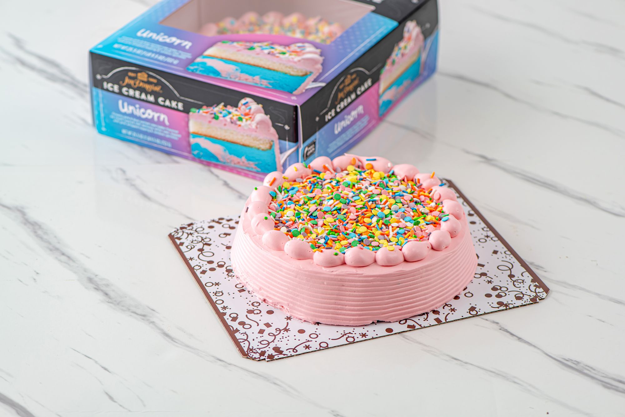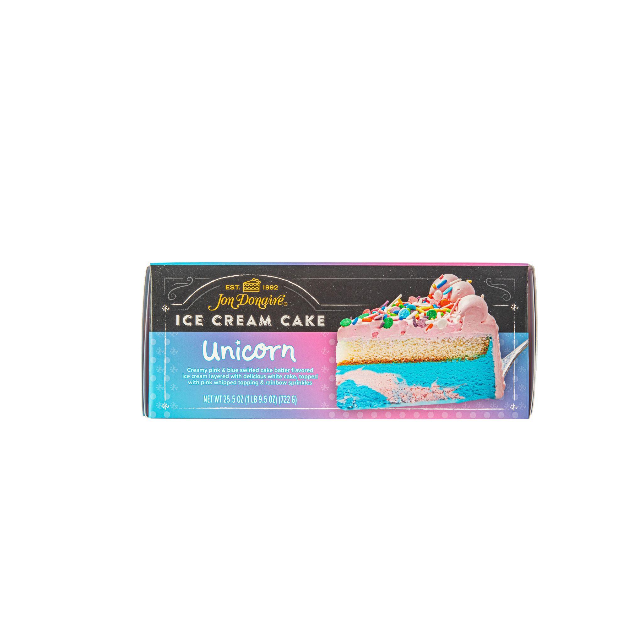 Cake battered flavored ice cream in pink and blue swirls layered with a layer of white cake. Decorated with pink whipped topping and rainbow sprinkles.