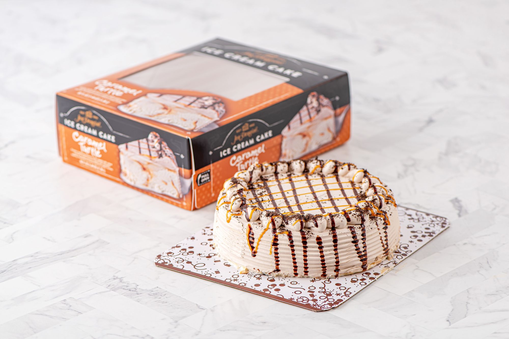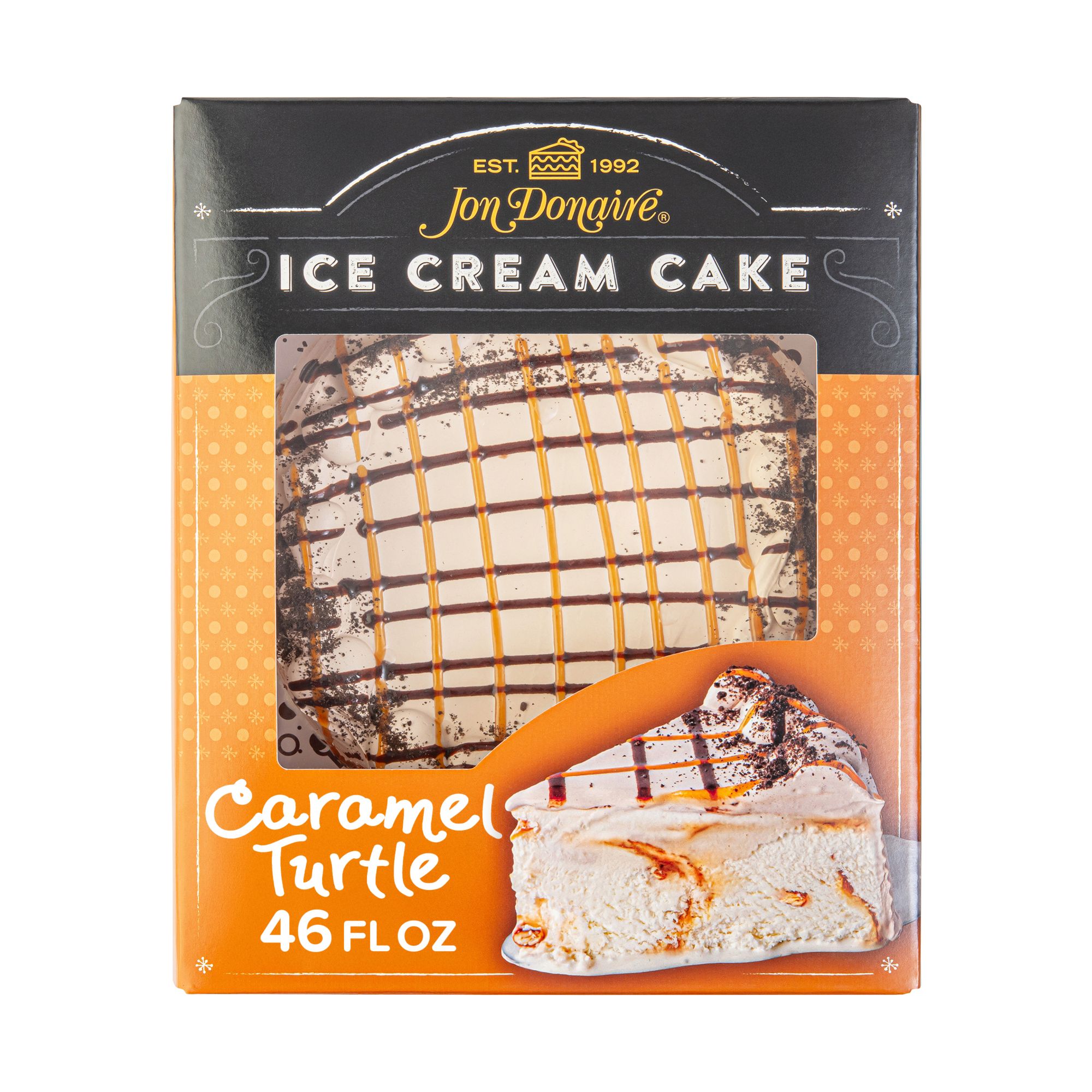 This ice cream cake comes in the classic Caramel Turtle style that all will love!
