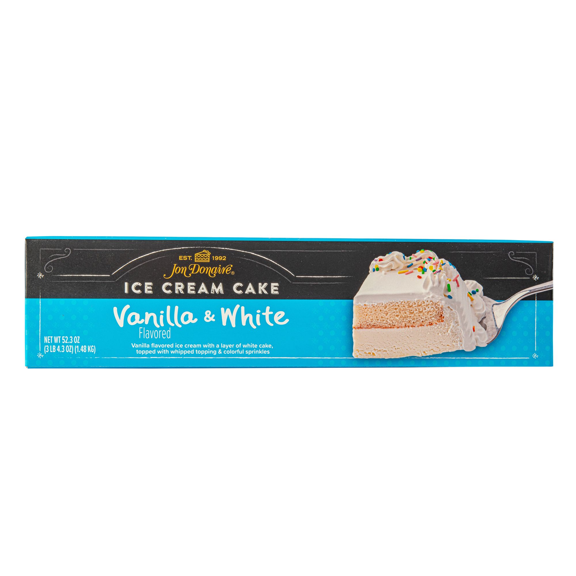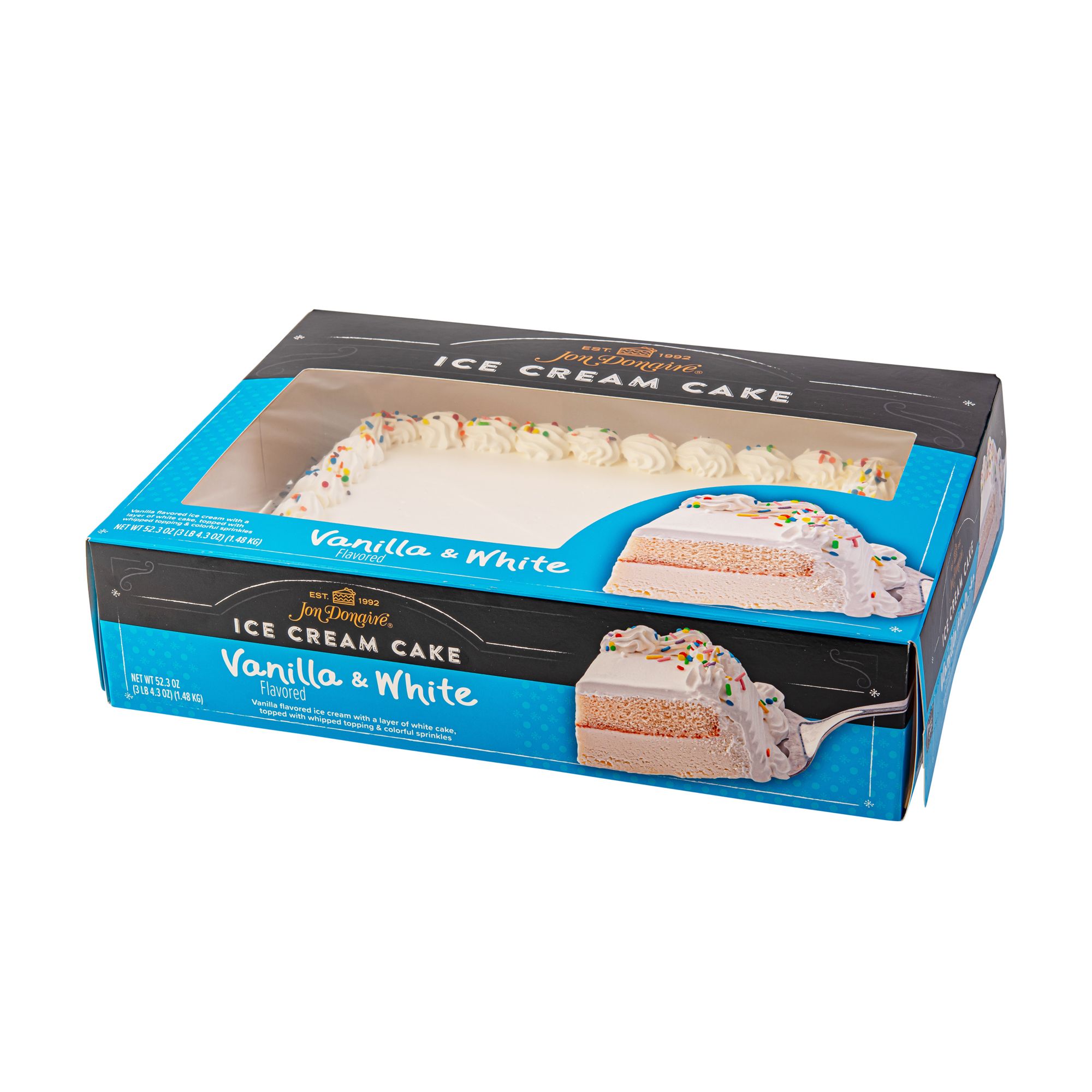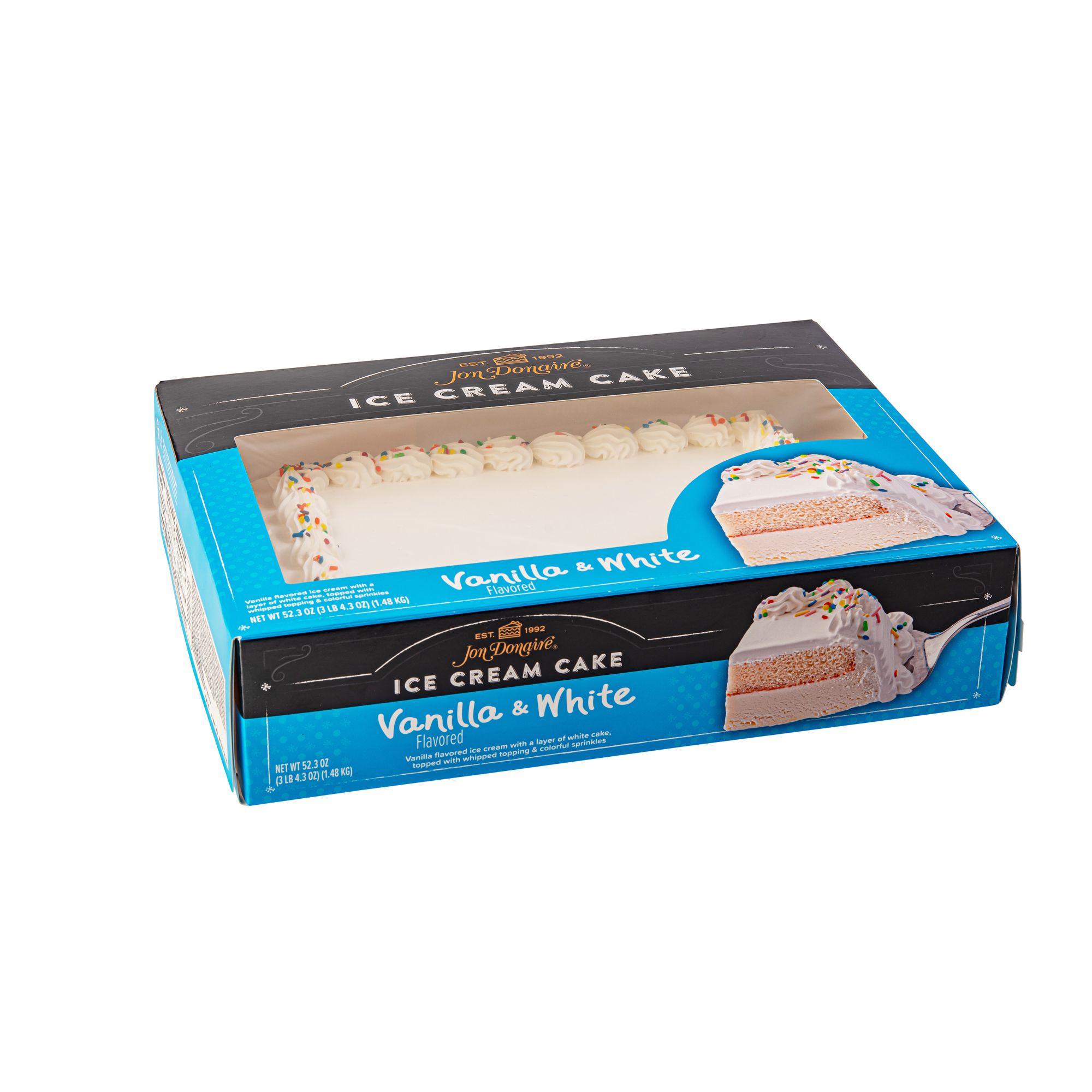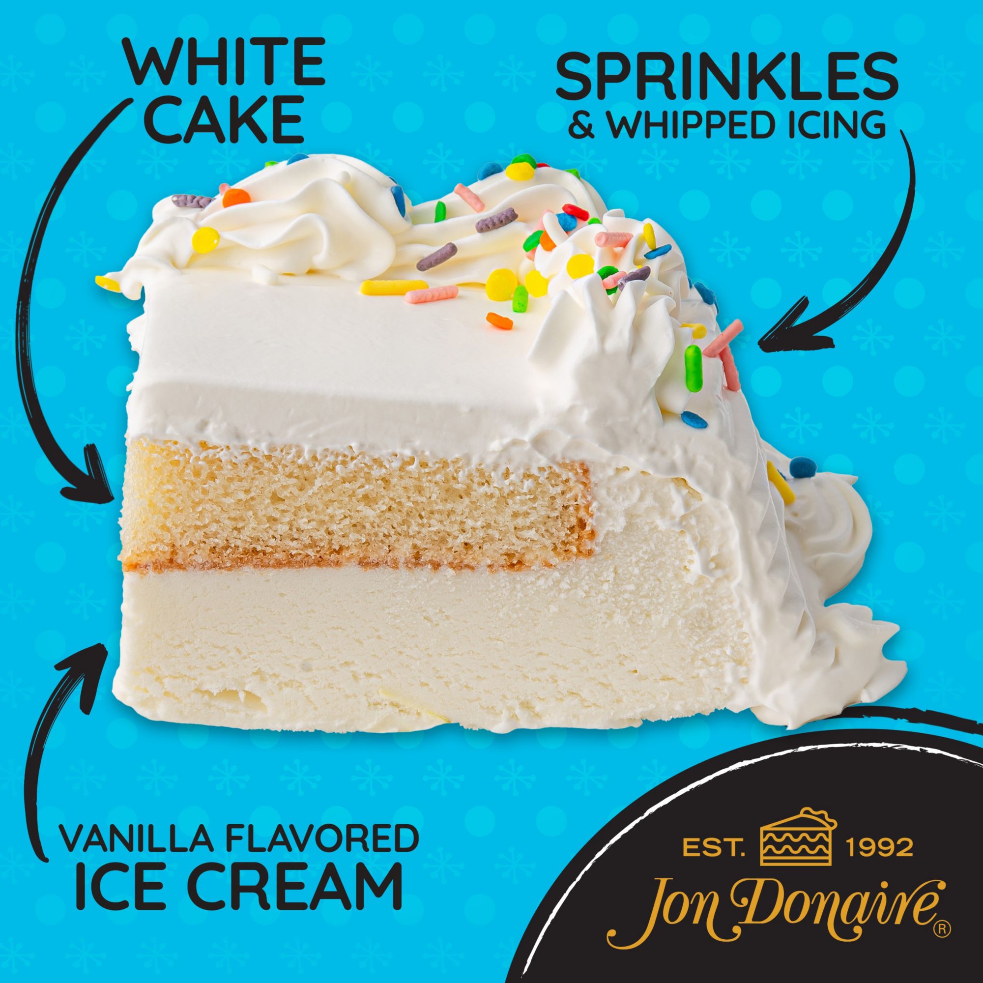 A decorated sheet cake with a layer of rich vanilla flavored ice cream below a moist white cake layer topped with whipped icing and sprinkles. Combining the joy of two beloved desserts – cake and ice cream – into one experience. More than simply dessert, Jon Donaire Ice Cream Cakes bring people together for some of life’s sweetest moments, from milestones to social and casual gatherings.