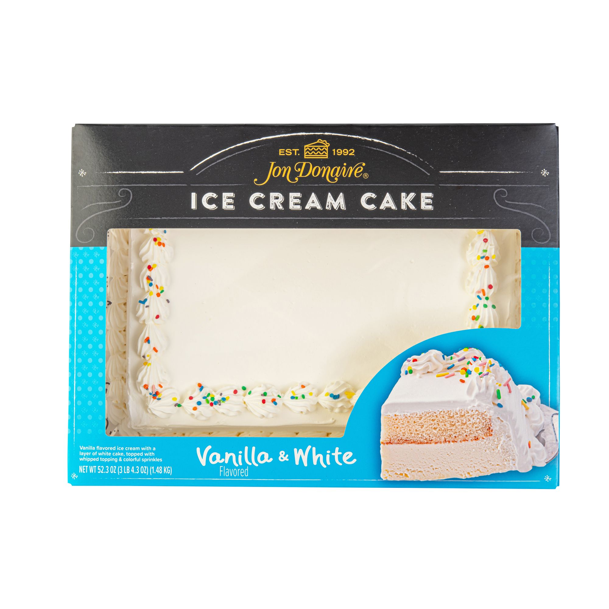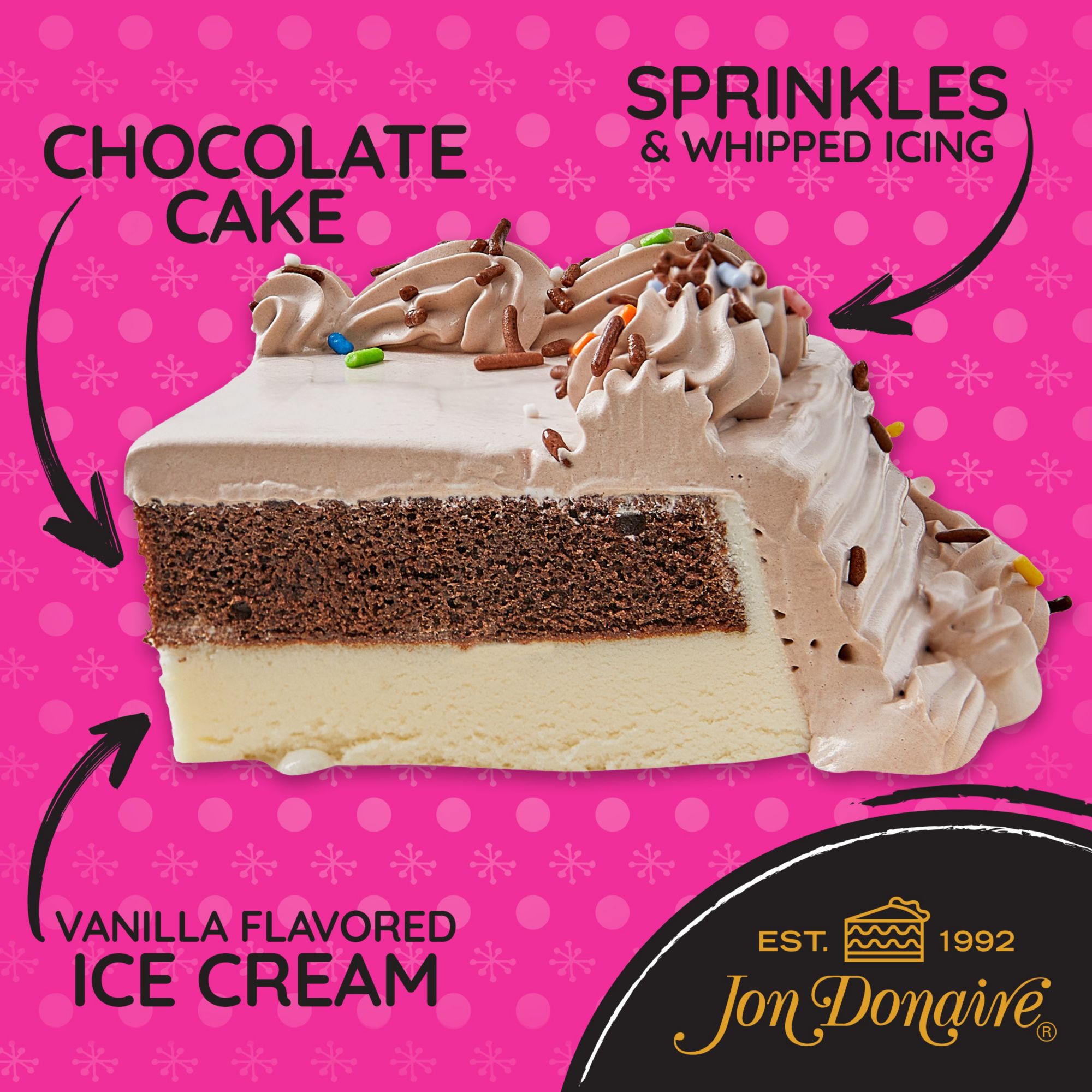 A decorated sheet cake with a layer of rich vanilla flavored ice cream below a moist chocolate naturally and artificially flavored cake layer topped with whipped icing and sprinkles. Combining the joy of two beloved desserts – cake and ice cream – into one experience. More than simply dessert, Jon Donaire Ice Cream Cakes bring people together for some of life’s sweetest moments, from milestones to social and casual gatherings.