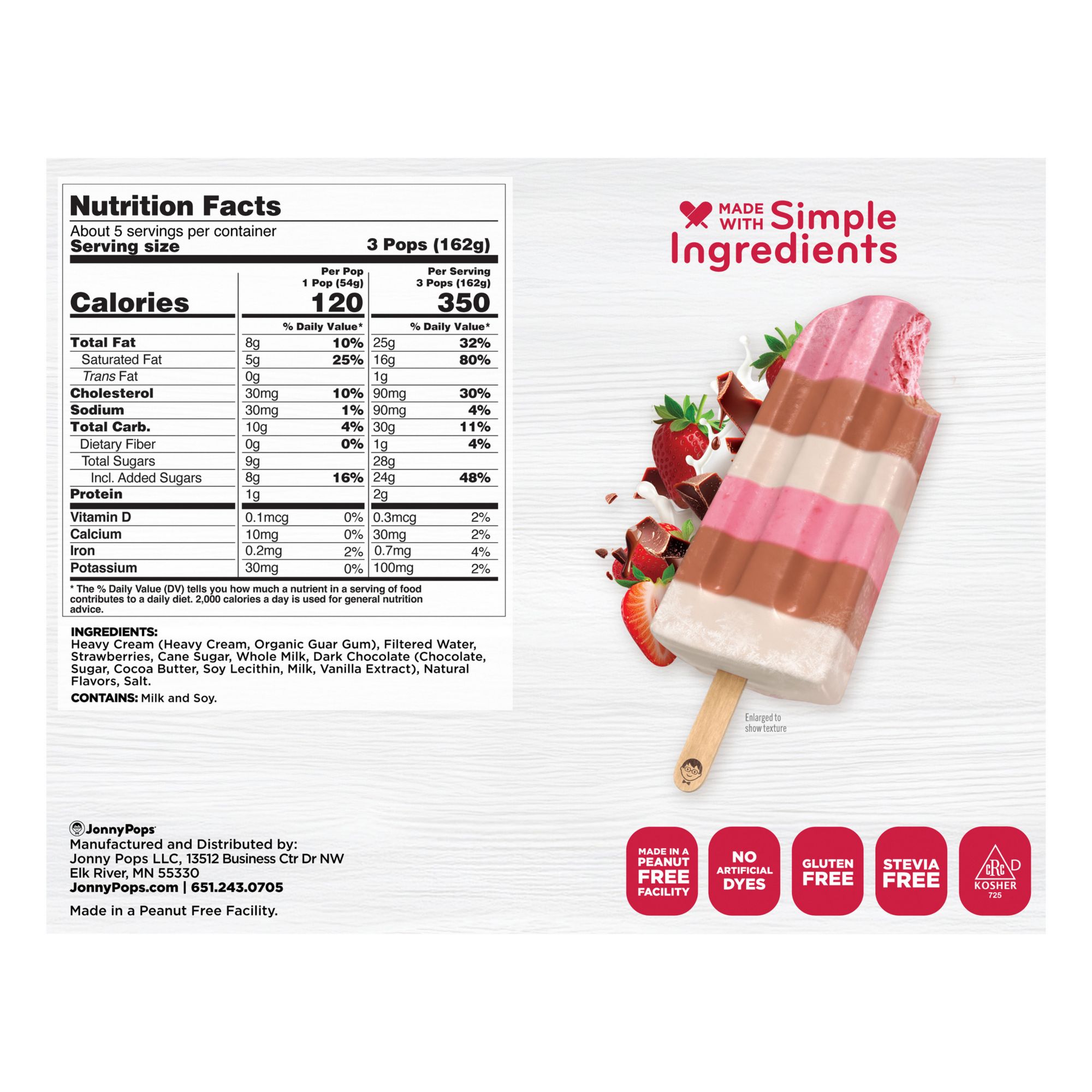 Strawberry, chocolate and vanilla flavored pops with cream. A Better Pop. The simpler the ingredients, the more delicious the pop. It's why JonnyPops uses a few wholesome ingredients and blend in small batches with care. JonnyPops mission is to create A Better Pop For A Better World. At JonnyPops, we believe that sharing kindness helps us achieve our mission of making the world a better place, one pop at a time. We can’t make a difference without you and we hope our pops encourage you to pay it forward in your communities - through random acts of kindness and by sharing the undeniable yumminess of JonnyPops with family and friends!