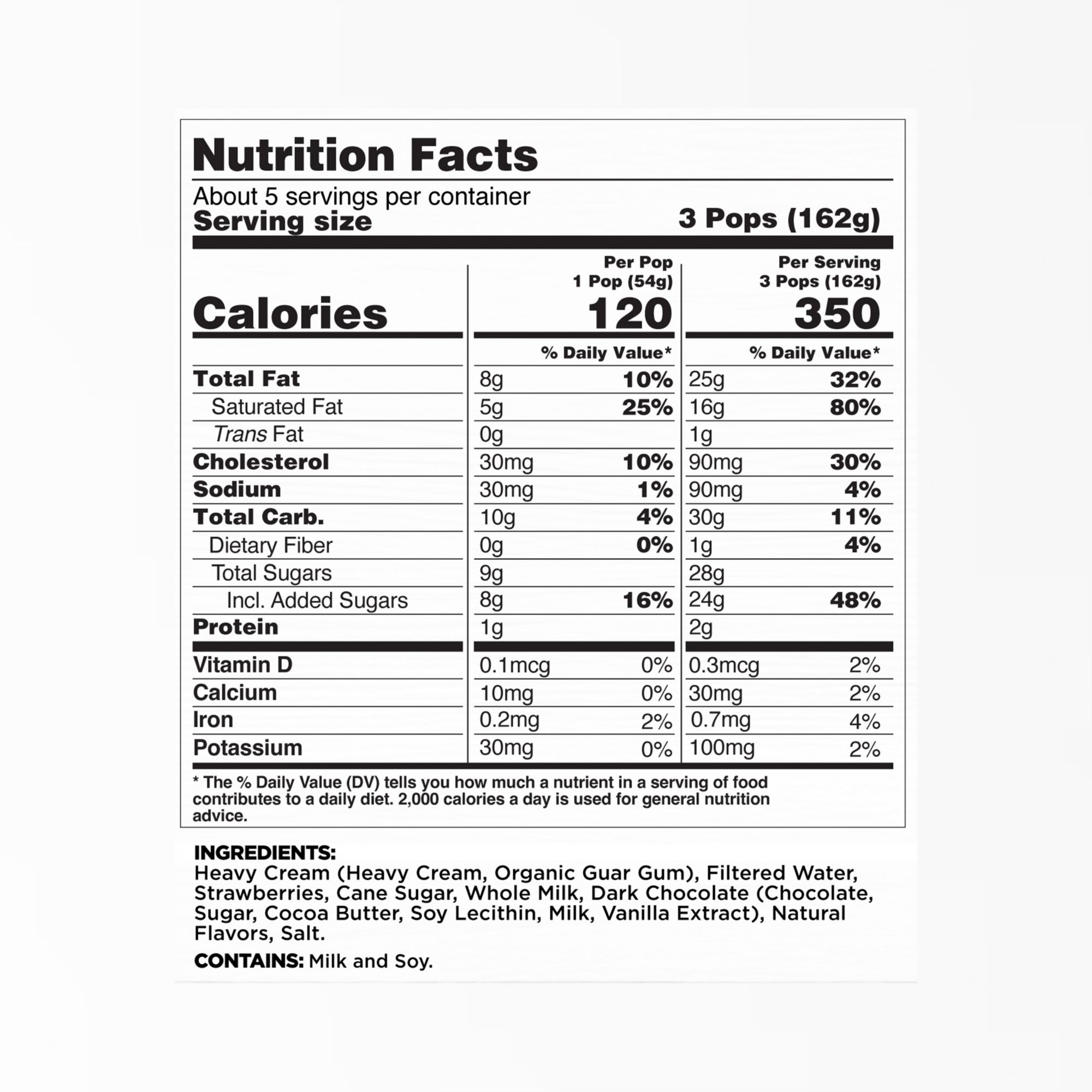 Ingredients: Heavy Cream (Heavy Cream, Organic Guar Gum), Purified Water, Strawberries, Cane Sugar, Whole Milk, Dark Chocolate (Chocolate, Sugar, Cocoa Butter, Soy Lecithin, Natural Vanilla Extract), Natural Flavors, Salt. Contains: Milk, Soy.