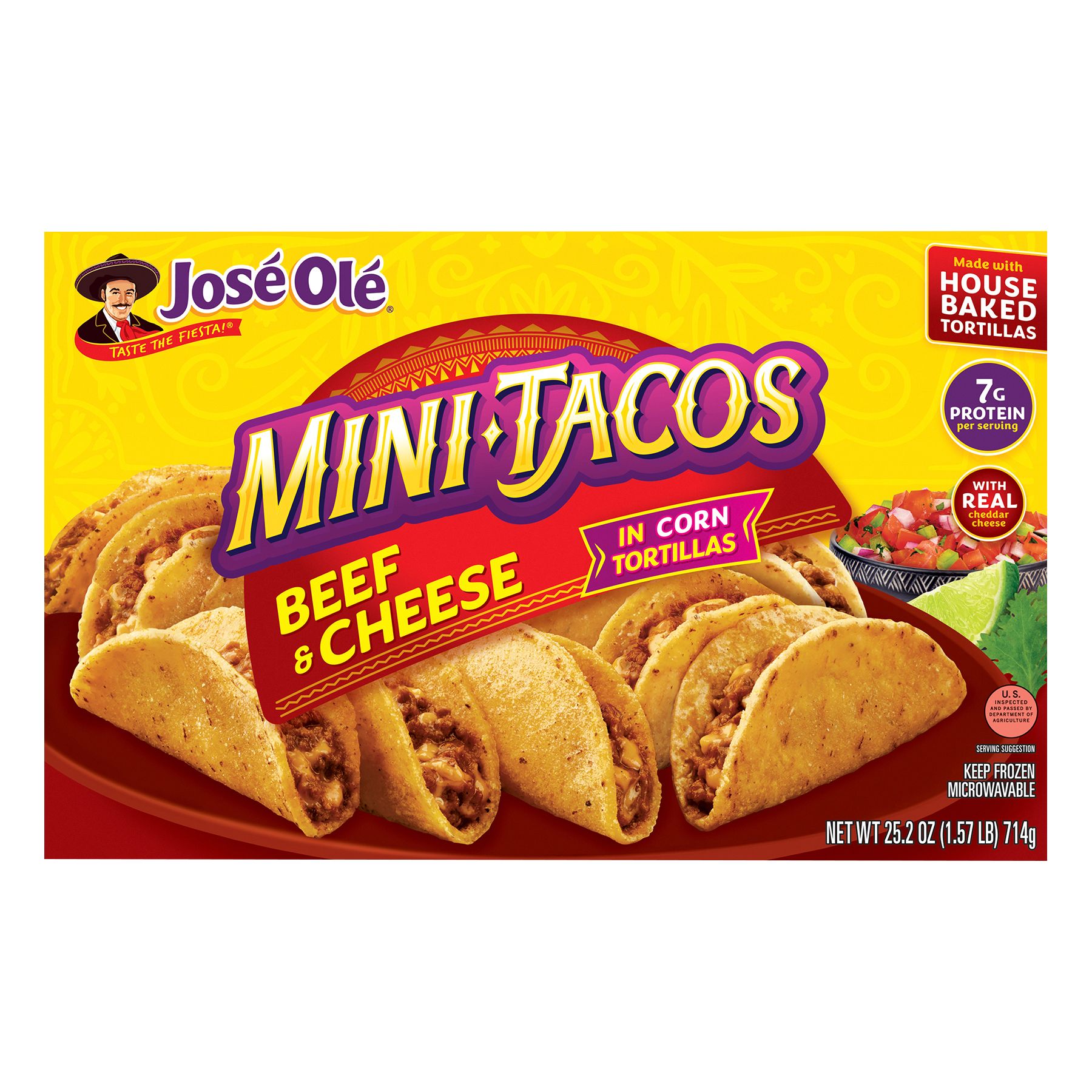 These Beef & Cheese Mini Tacos feature a crunchy, oven-baked corn tortilla folded around seasoned ground beef, real cheddar cheese, onions, zesty green chiles and authentic seasonings and spices. Comprised of a crunchy corn tortilla packed with a delicious beef and cheese filling, these Mini Tacos pair perfectly with your favorite queso or salsa dip!