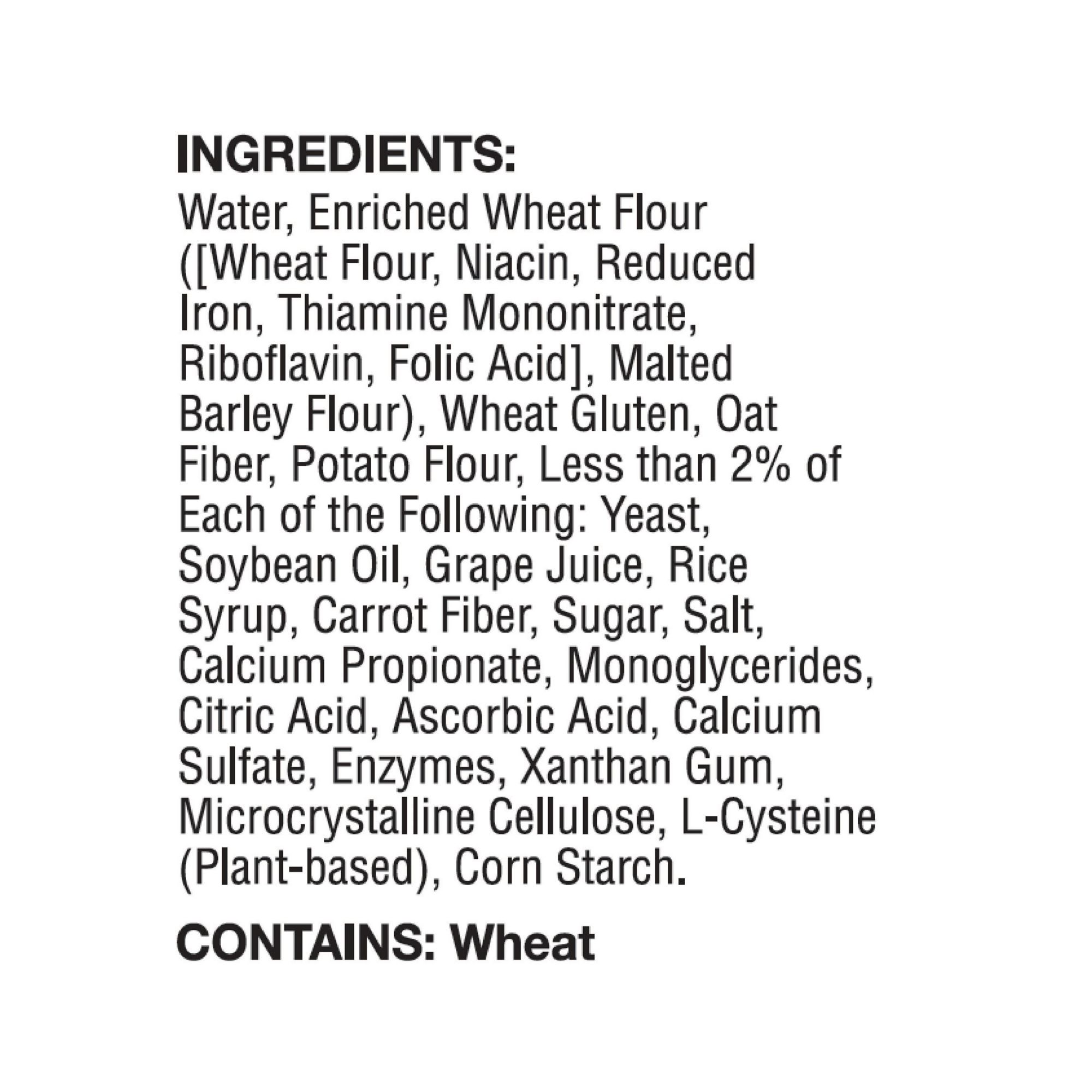 Ingredients: Water, Whole Wheat Flour, Wheat Gluten, Oat Fiber, Corn Starch, Soy Flour, Soy Protein Isolate, Enriched Wheat Flour [Wheat Flour, Niacin, Reduced Iron, Thiamine Mono-nitrate, Riboflavin, Folic Acid], Golden Flax Seed, Yeast, Contains Less than 2% of Soybean Oil, Oat Bran, Salt, Calcium Sulfate, Sodium Acid Pyrophosphate, Dextrose, Sodium Bicarbonate, Potassium Sorbate, Fumaric Acid, Monoglyceride, Sodium Metabisulfite, Calcium Propionate, L-Cysteine (Microcrystalline Cellulose, L-Cysteine, Corn Starch), Enzymes.