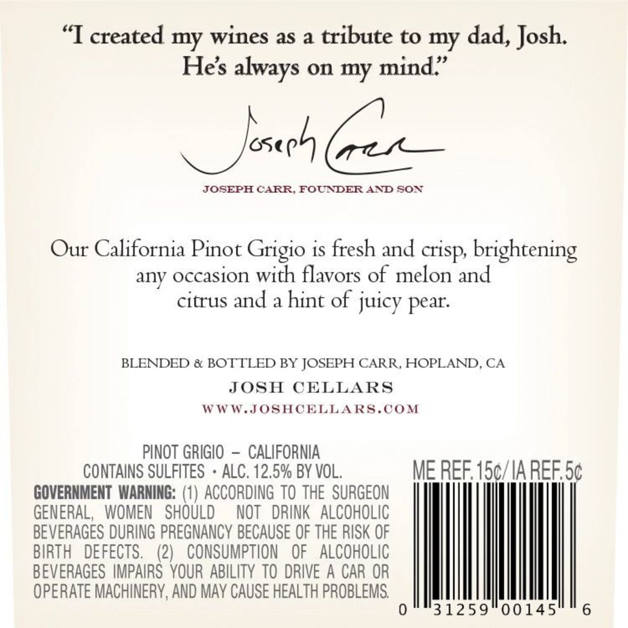 Our fresh and crisp California Pinot Grigio brightens any occasion with notes of citrus and melon. Pair this wine with lighter seafood dishes, salads with citrus dressing, or enjoy with finger foods like mild cheese or bruschetta with tomato and basil. This Josh Cellars Pinot Grigio bottle of wine is 750 ml and is 12% ABV. Created by Joseph Carr and named after his father, Josh Cellars makes high-quality, well-balanced, delicious wines that are expressions of gratitude grounded in hard work, high standards and the recognition of others. Josh wine is worth sharing with those who matter.