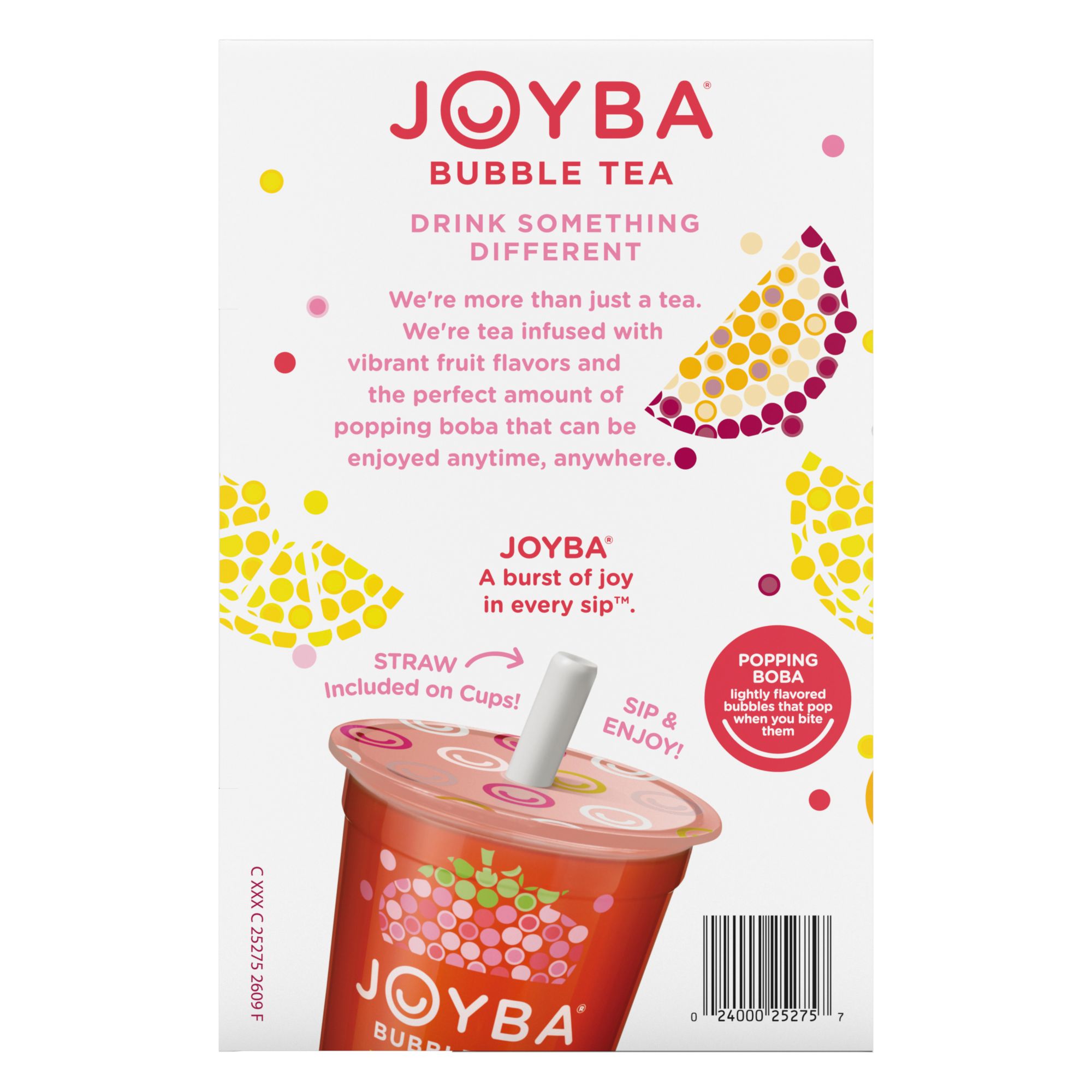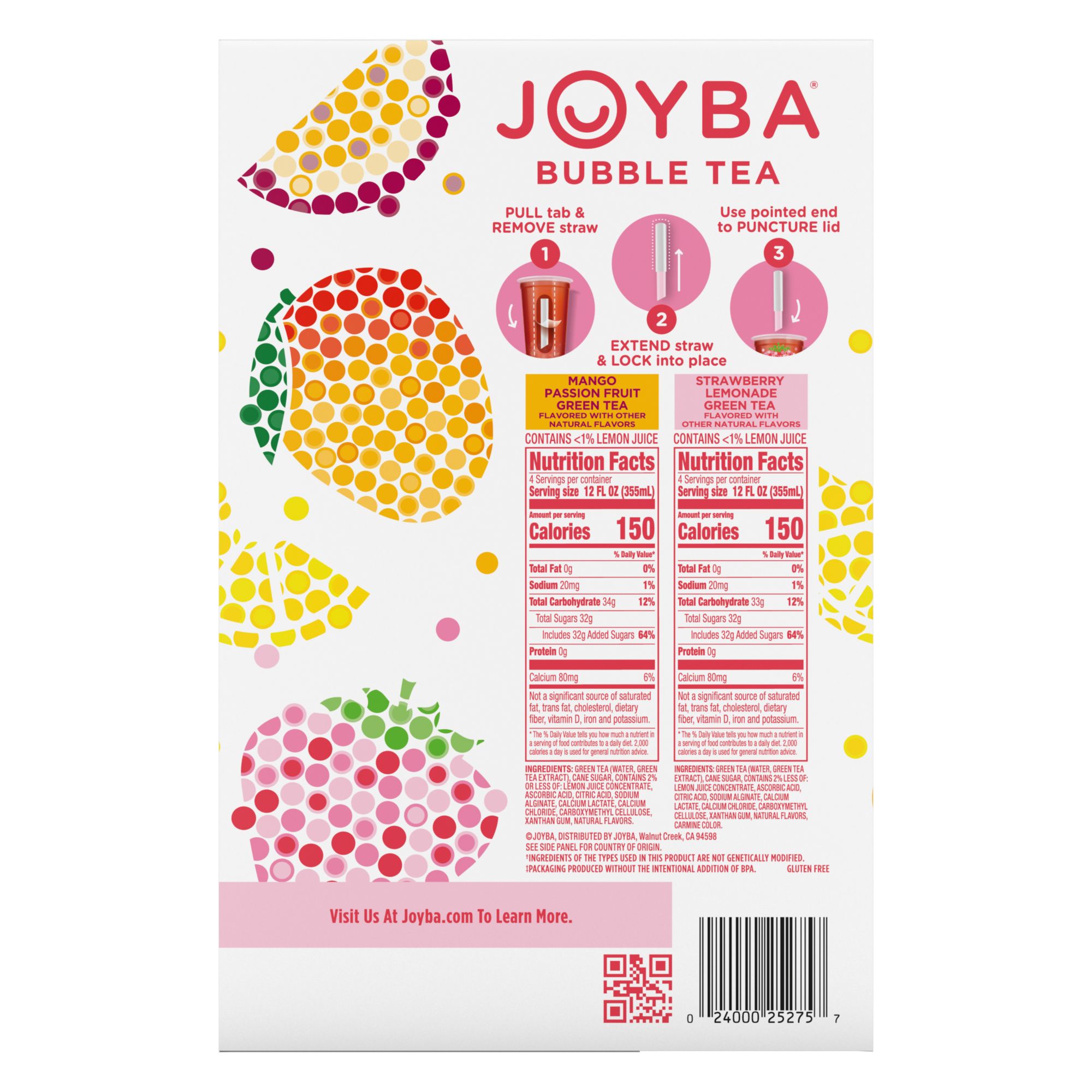 Joyba Bubble Tea is an exciting Boba Tea shop experience for you to enjoy anytime, anywhere! Made with real brewed tea infused with vibrant fruit flavor, each refreshing Joyba Bubble Tea offers the perfect amount of popping boba for a burst of joy in every sip. This 8 count Variety Pack contains two flavors. Joyba Tea Strawberry Lemonade and Mango Passionfruit bubble teas have lightly flavored bubbles that pop when you bite them, include no artificial sweeteners and are Non-GMO*. Each convenient cup includes a straw so you can sip Joyba on the go! Each Non-BPA lining** cup is ready to drink for a convenient, refreshing treat.