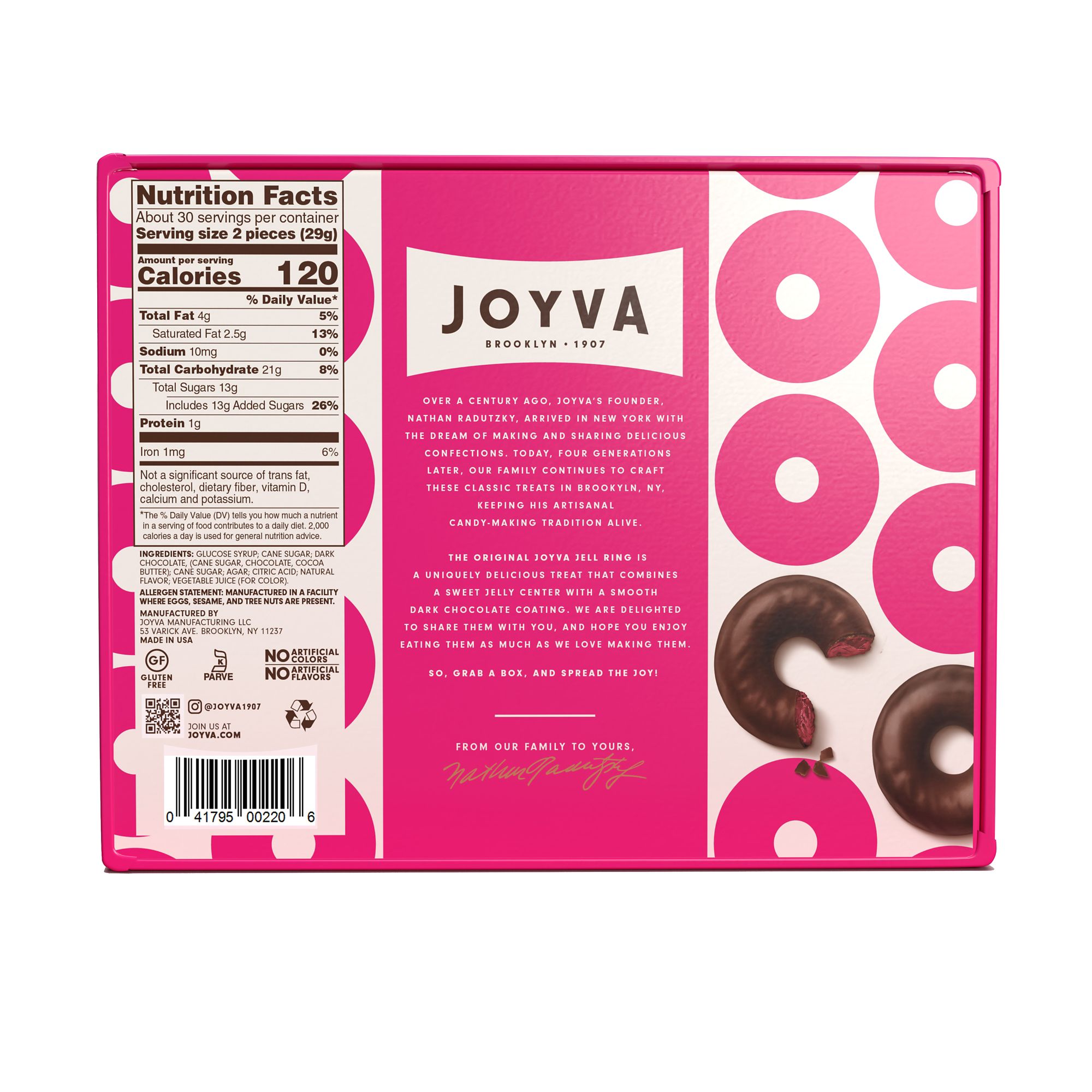 Welcome to the Joyva Family! With over 116 years of being family-owned, they cherish the care and pride instilled by founders, which continues to drive the creation of their beloved products. From their family to yours! The Original Joyva Jell Rings are a uniquely delicious treat that combines a sweet jelly center with a smooth dark chocolate coating. Made in Brooklyn, New York, they are great for gatherings with friends and family or a personal dessert or snack. So grab a box and spread some joy! Joyva Jell Rings are gluten free, Kosher Parve, dairy free, soy free and no artificial colors or flavorings.