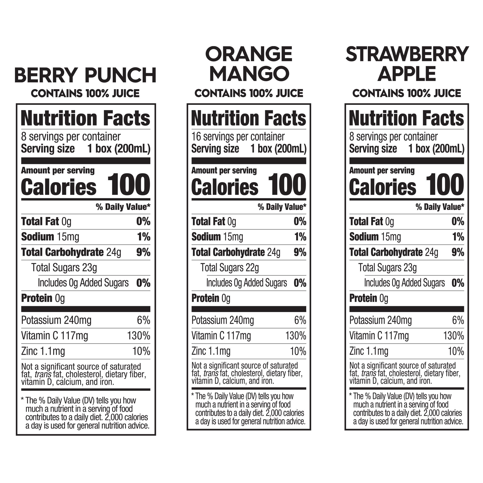 Ingredients: Strawberry Apple: Apple Juice From Concentrate (Water, Juice Concentrate), Pear Juice From Concentrate (Water, Juice Concentrate), Strawberry Juice From Concentrate (Water, Juice Concentrate), Ascorbic Acid (Vitamin C), Citric Acid, Natural Flavors, Zinc Gluconate. Orange Mango: Apple Juice From Concentrate (Water, Juice Concentrate), Pear Juice From Concentrate (Water, Juice Concentrate), Orange Juice From Concentrate (Water, Juice Concentrate), Ascorbic Acid (Vitamin C), Mango Puree From Concentrate (Water, Puree Concentrate), Natural Flavors, Citric Acid, Zinc Gluconate. Berry Punch: Apple Juice From Concentrate (Water, Juice Concentrate), Pear Juice From Concentrate (Water, Juice Concentrate), Strawberry Juice From Concentrate (Water, Juice Concentrate), Ascorbic Acid (Vitamin C), Raspberry Juice From Concentrate (Water, Juice Concentrate), Natural Flavors, Citric Acid, Zinc Gluconate.