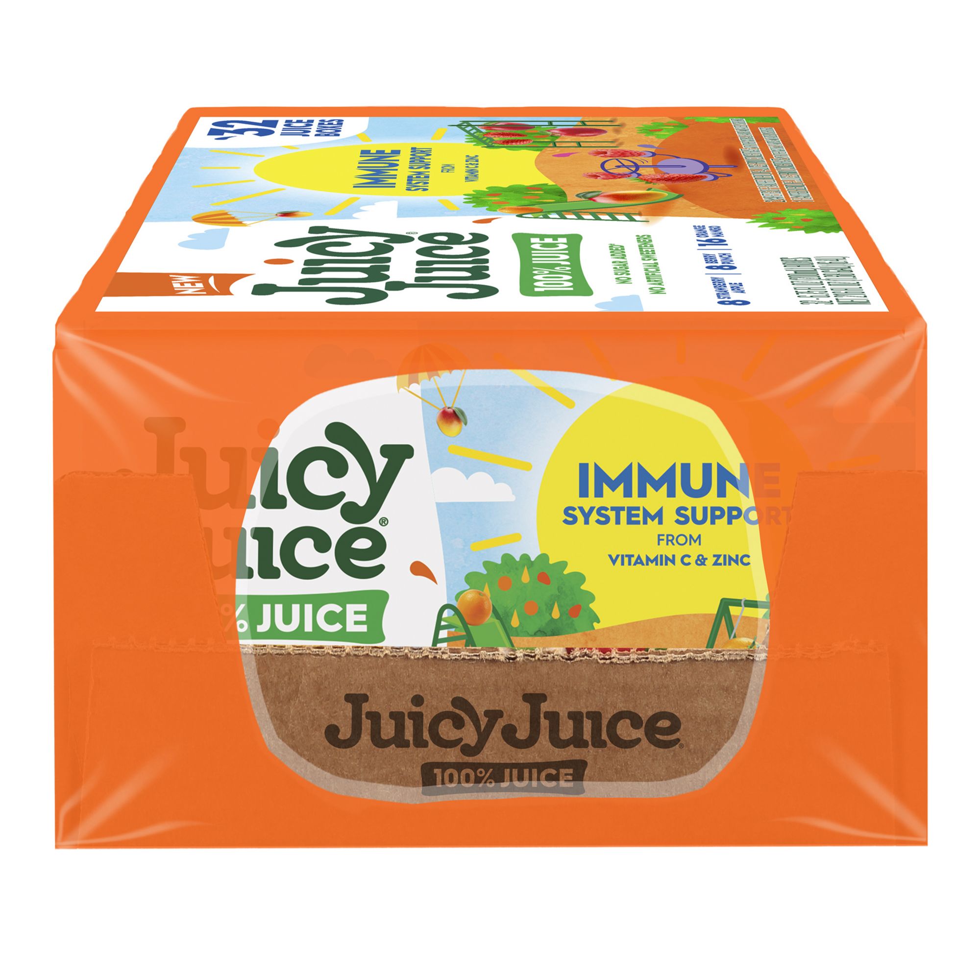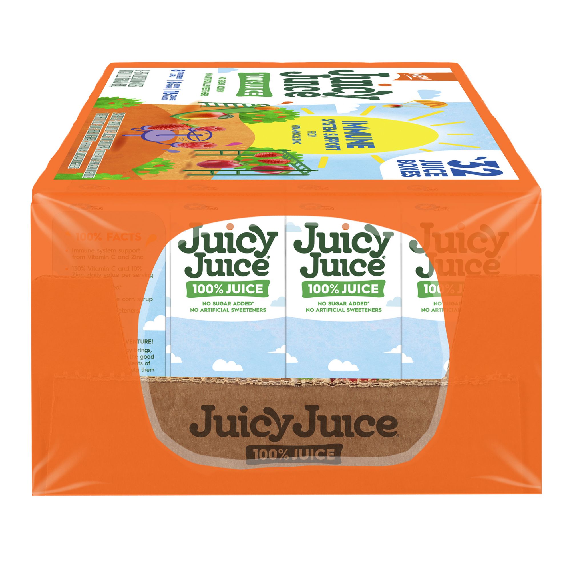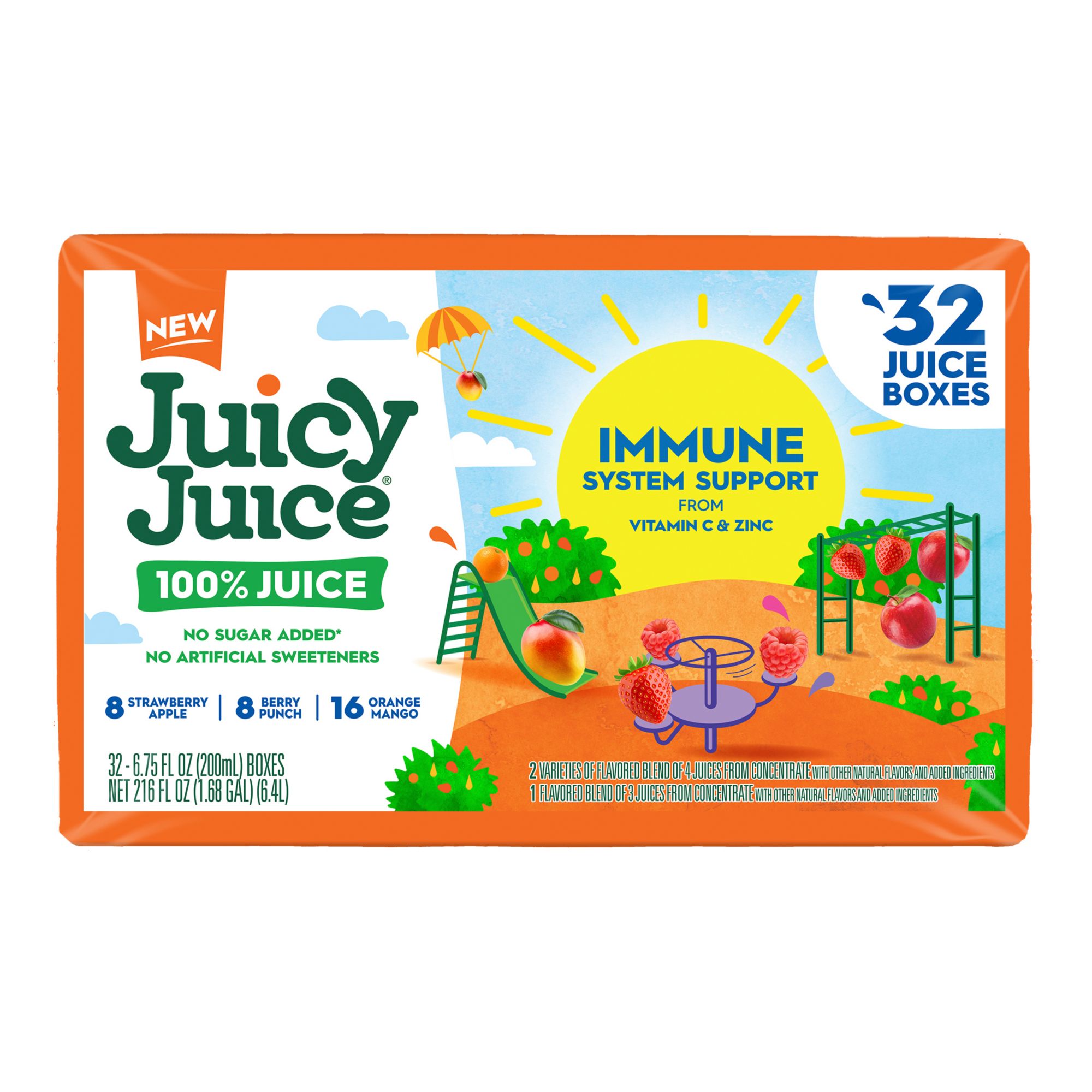 Enjoy the taste of 100% fruit juice fortified with Vitamin C and Zinc for Immune System Support. The sweetness in this no sugar added juice comes straight from fruit for a delicious flavors that kids love. With no sugar added, no high fructose corn syrup and no artificial sweeteners, this 100% juice is an excellent choice for the whole family. Juicy Juice Immune System Support from Vitamin C and Zinc makes parents and kids happy by providing 130% daily value of Vitamin C and 10% daily value of Zinc in each 6.75 oz. juice box. Pack this juice in a lunchbox or enjoy you juice box for an on the go drink. This variety pack includes 32 juice boxes in Orange Mango, Strawberry Apple and Berry Punch. With a variety of kids juices in single serve juice boxes and resealable multi serve bottles, Juicy Juice is the easy choice that parents can feel good about!