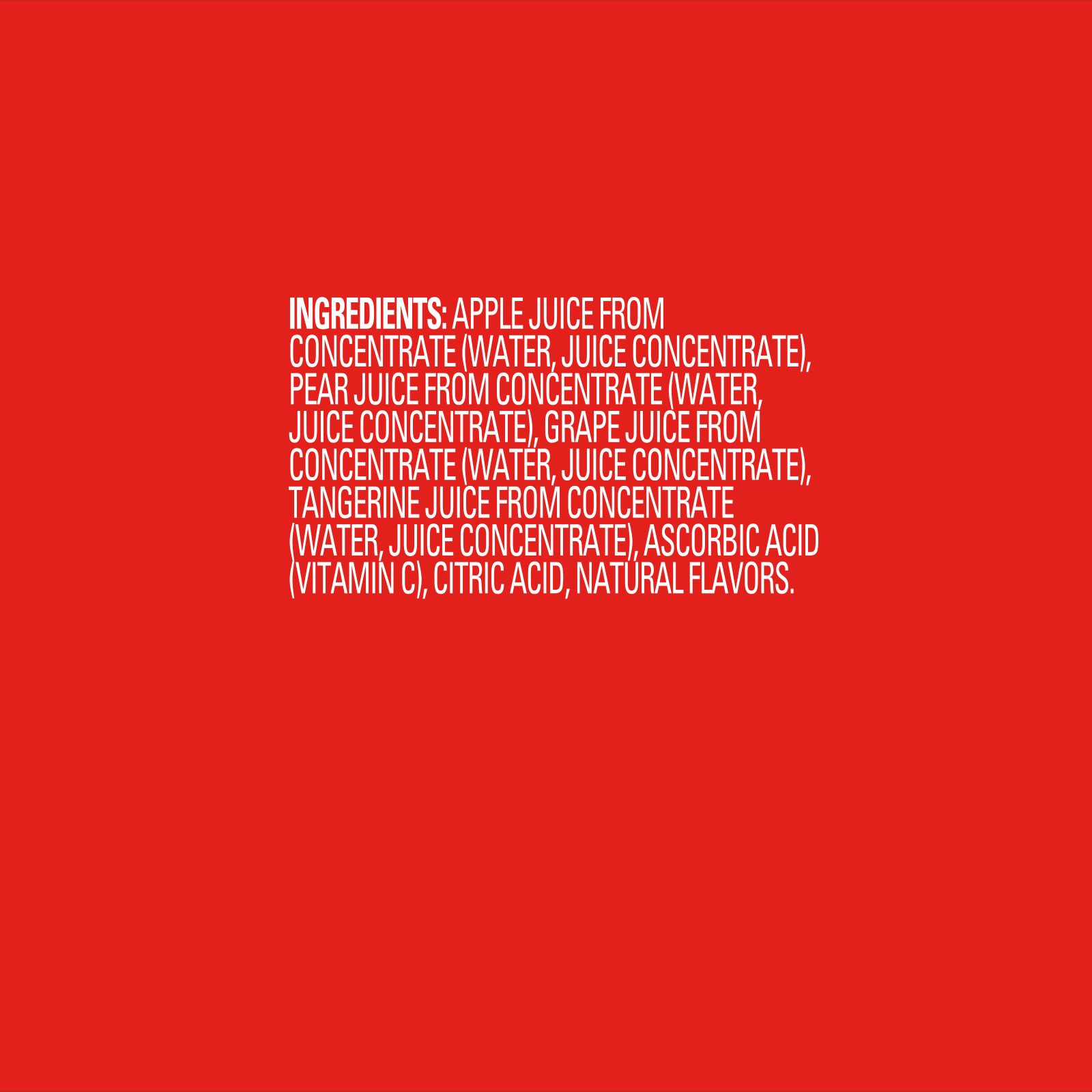 Apple Juice From Concentrate (Water, Juice Concentrate), Pear Juice From Concentrate (Water, Juice Concentrate), Grape Juice From Concentrate (Water, Juice Concentrate), Tangerine Juice From Concentrate (Water, Juice Concentrate), Ascorbic Acid (Vitamin C), Citric Acid, Natural Flavors.