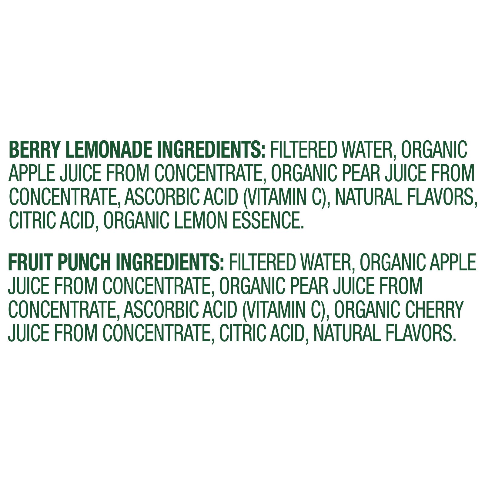 Ingredients:Berry Lemonade: Filtered water, Organic Apple Juice From Concentrate, Organic pear juice from concentrate, ascorbic acid (vitamin C), Natural Flavors, citric acid, Organic lemon essence Fruit Punch: Filtered Water, Organic Apple juice from concentrate, organic pear juice from concentrate, ascorbic acid (vitamin C), Organic Cherry juice from concentrate, Citric acid, natural flavor