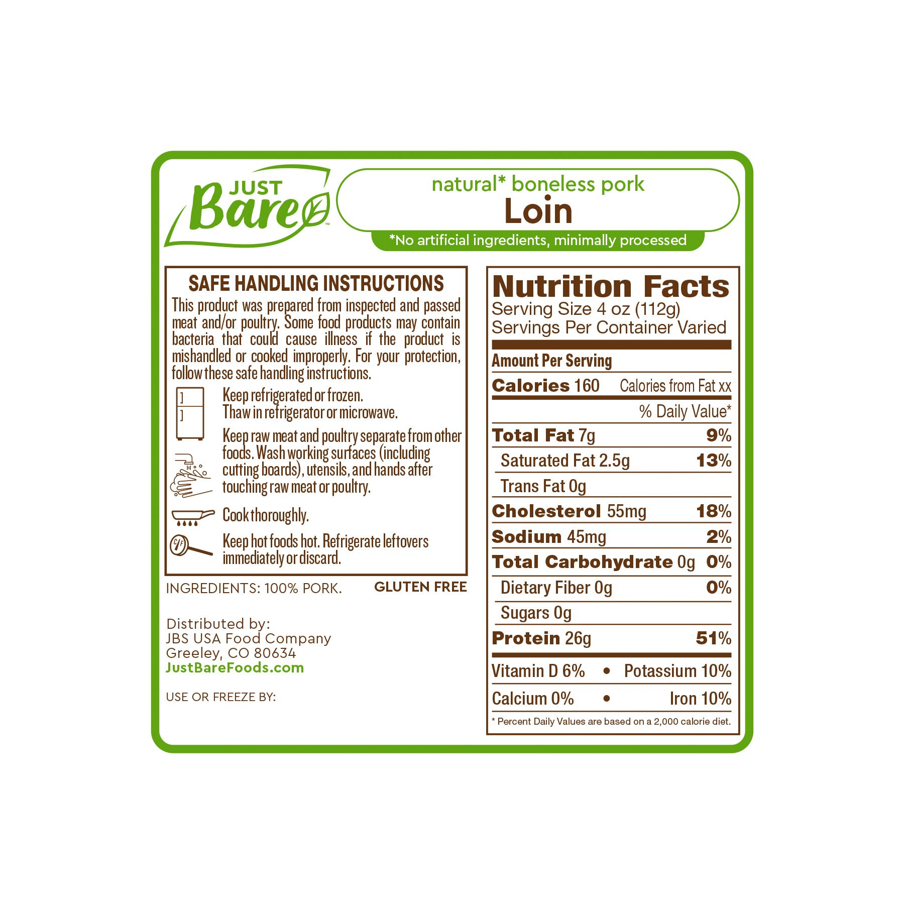 Just Bare Pork Boneless Pork Loin is made without antibiotics. This natural pork has no added hormones or steroids, no artificial ingredients, and is minimally processed. This pork loin is great on the grill or in the oven.