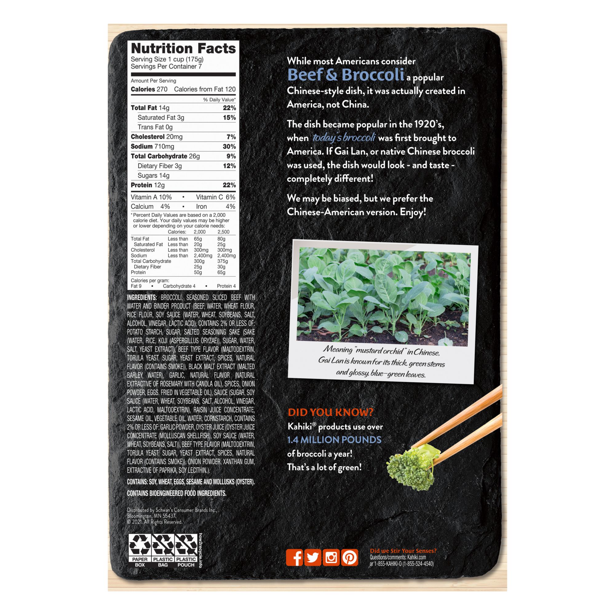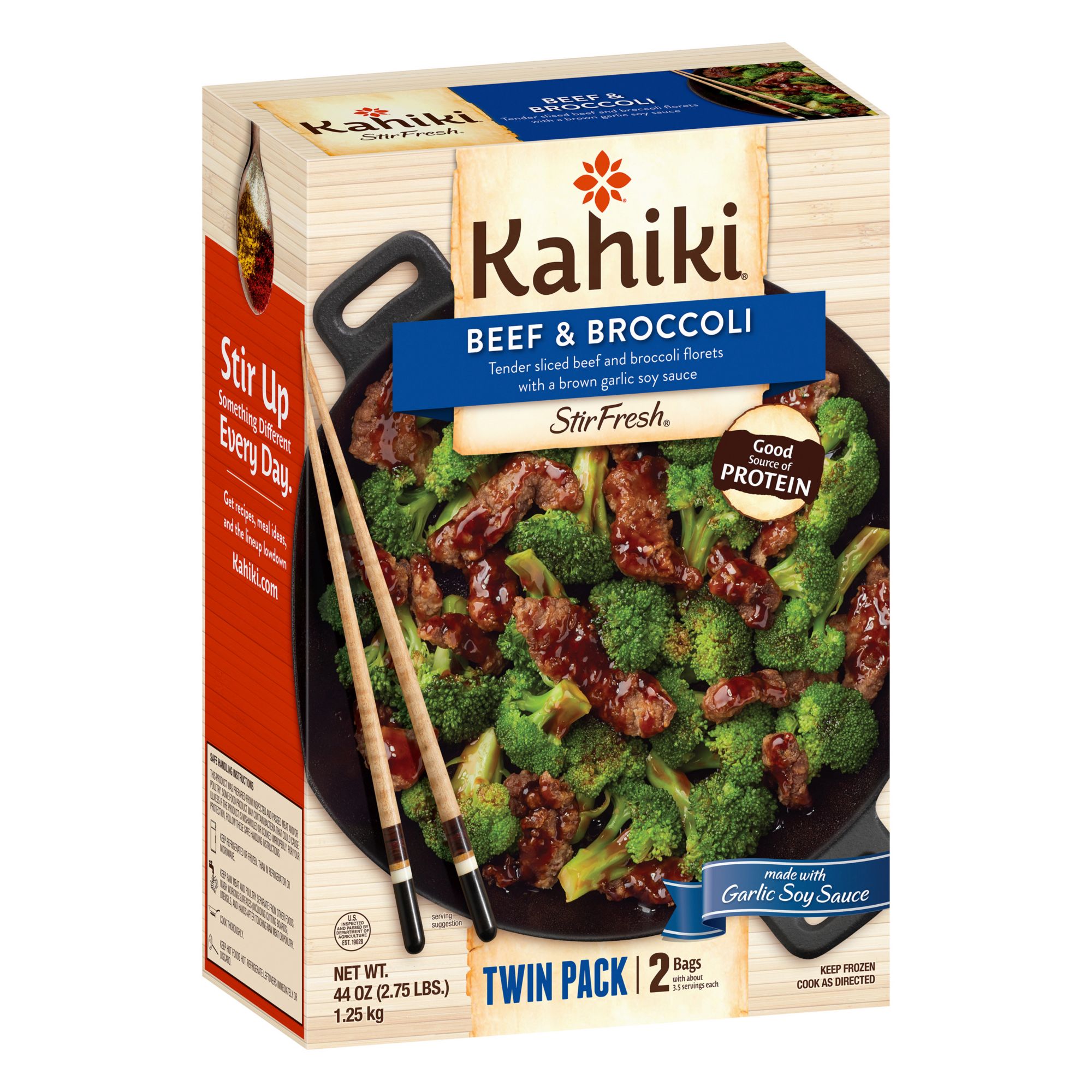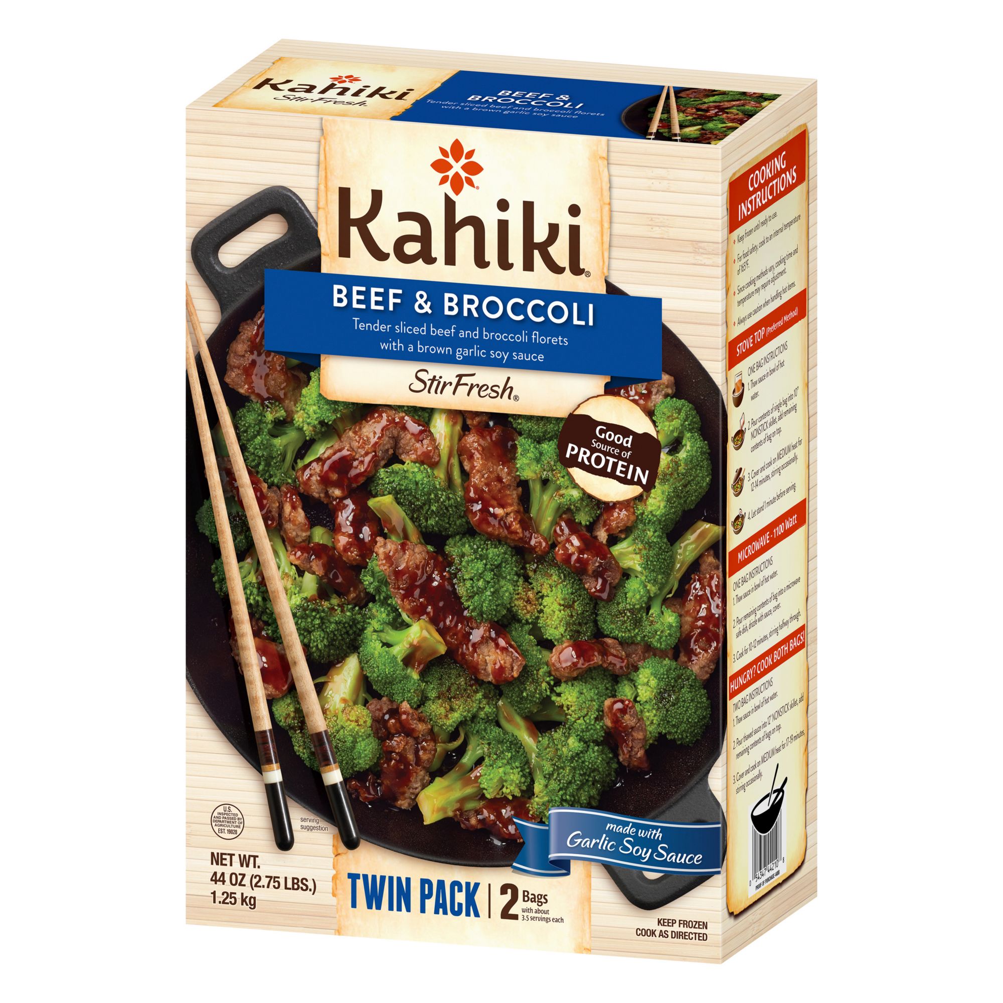Kahiki Beef & Broccoli StirFresh is made with tender sliced beef and broccoli florets with a brown garlic soy sauce. Ready for your skillet in seven minutes for an easy, delicious dinner. Each serving provides an excellent source of protein.