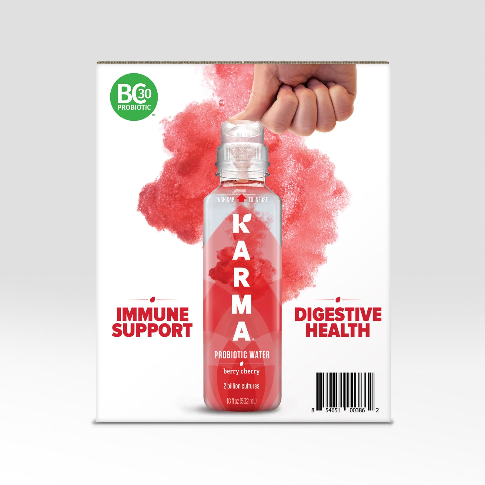 Probiotics in kombuchas and premixed drinks deteriorate over time. But Karma’s patented, protective Push Cap guarantees that their proprietary blend of vitamins and cultures is delivered at optimal potency. By storing out active ingredients in powder form in the cap, Karma is ensuring full efficacy on their vitamins and probiotics. When you are ready to consume, you simple peel the sticker off the cap, push the button to infuse the powder and shake to transform your water in wellness. Karma Probiotics are made with the patented probiotic strain Ganeden BC30 and deliver more than 10X the active cultures than yogurt. 70% of your body's immune system works off your digestive tract so Karma Probiotics helps with immune support and digestive health. Each bottle contains 100% of six essential vitamins: Vitamins A, E and B Complex (B3, B5, B6 and B12) along with two billion Probiotic Cultures. Each Karma Probiotic also contains the essential trace element Chromium which can improve insulin sensitivity and enhance protein, carbohydrate, and lipid metabolism. Each Karma bottle is 20 calories, non-GMO, vegan, gluten-free, lactose-free and certified Kosher. Naturally flavored and sweetened with a blend of pure cane sugar and stevia, Karma Probiotic Water's taste will leave you wanting to drink more. Just another reason to #BelieveInKarma and enjoy the benefits of the full potency of the vitamin and probiotics.