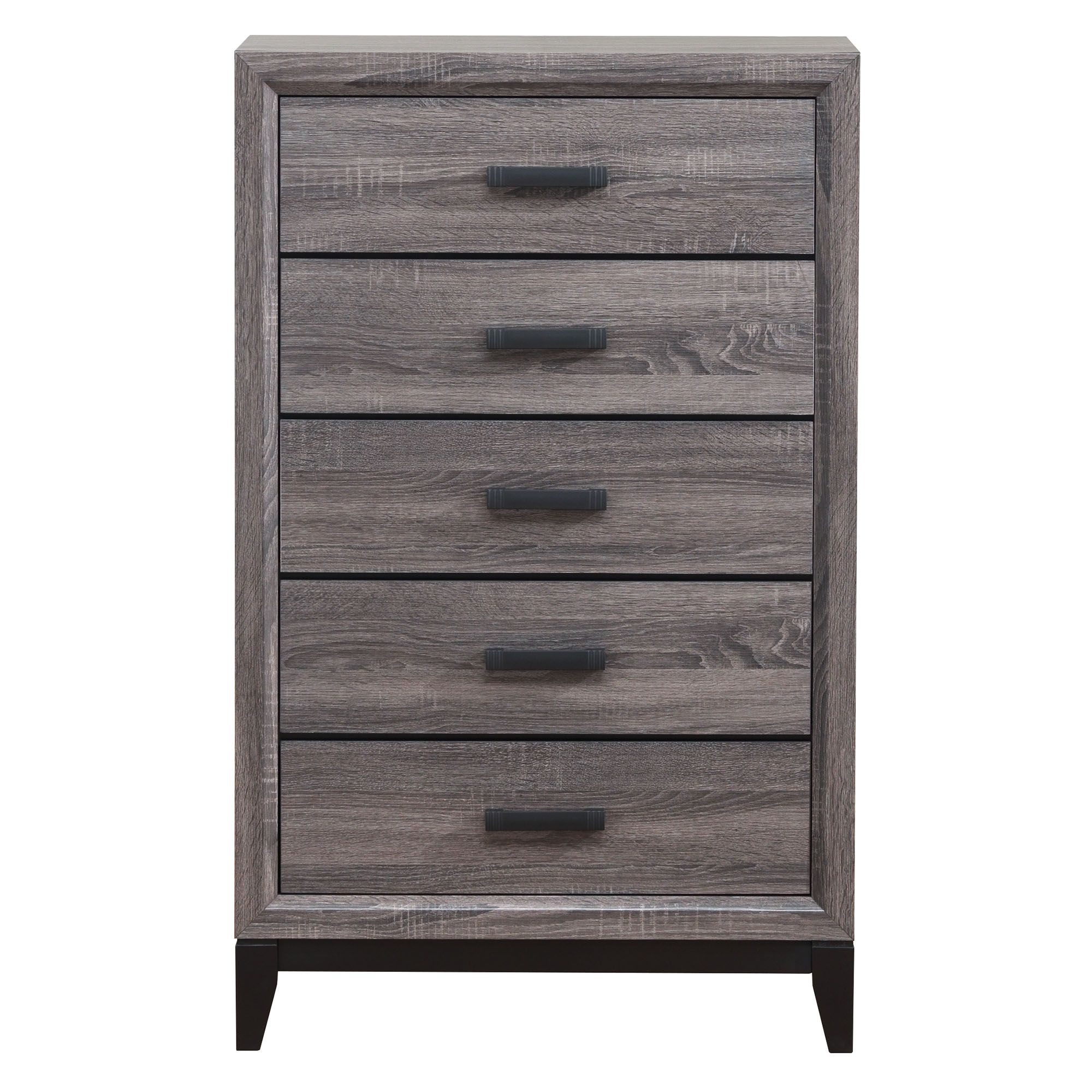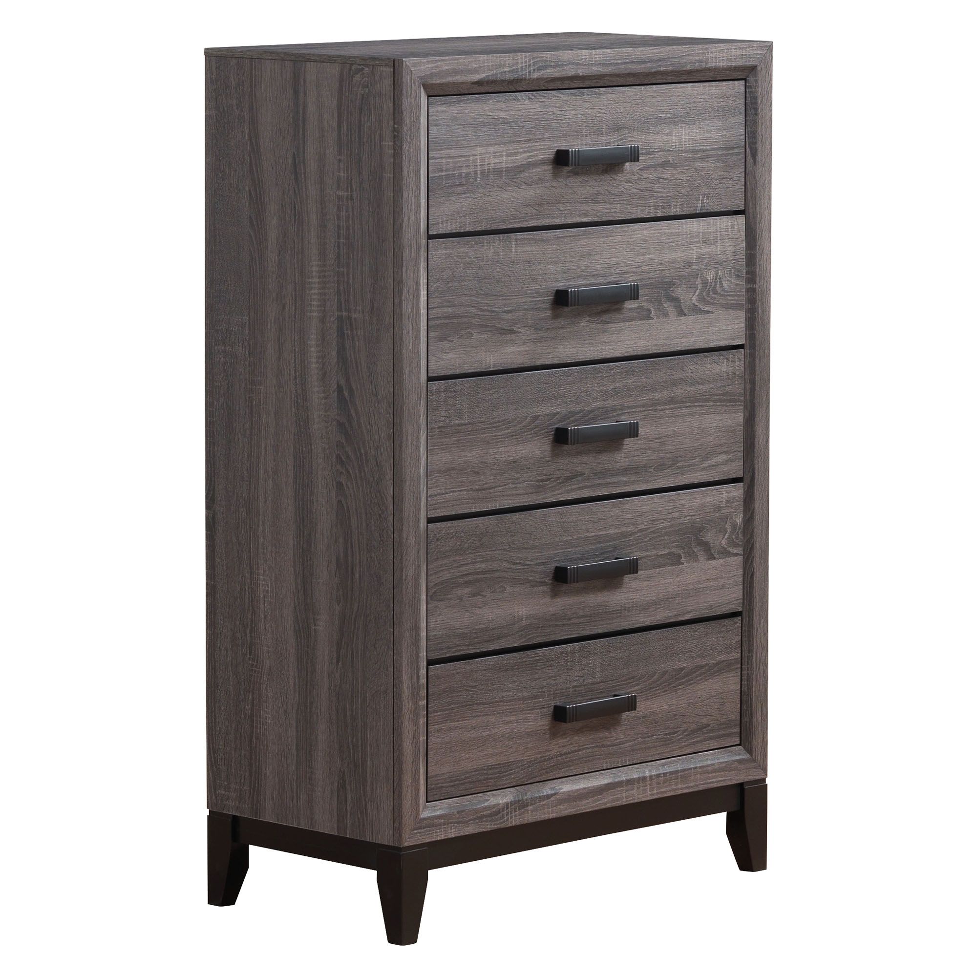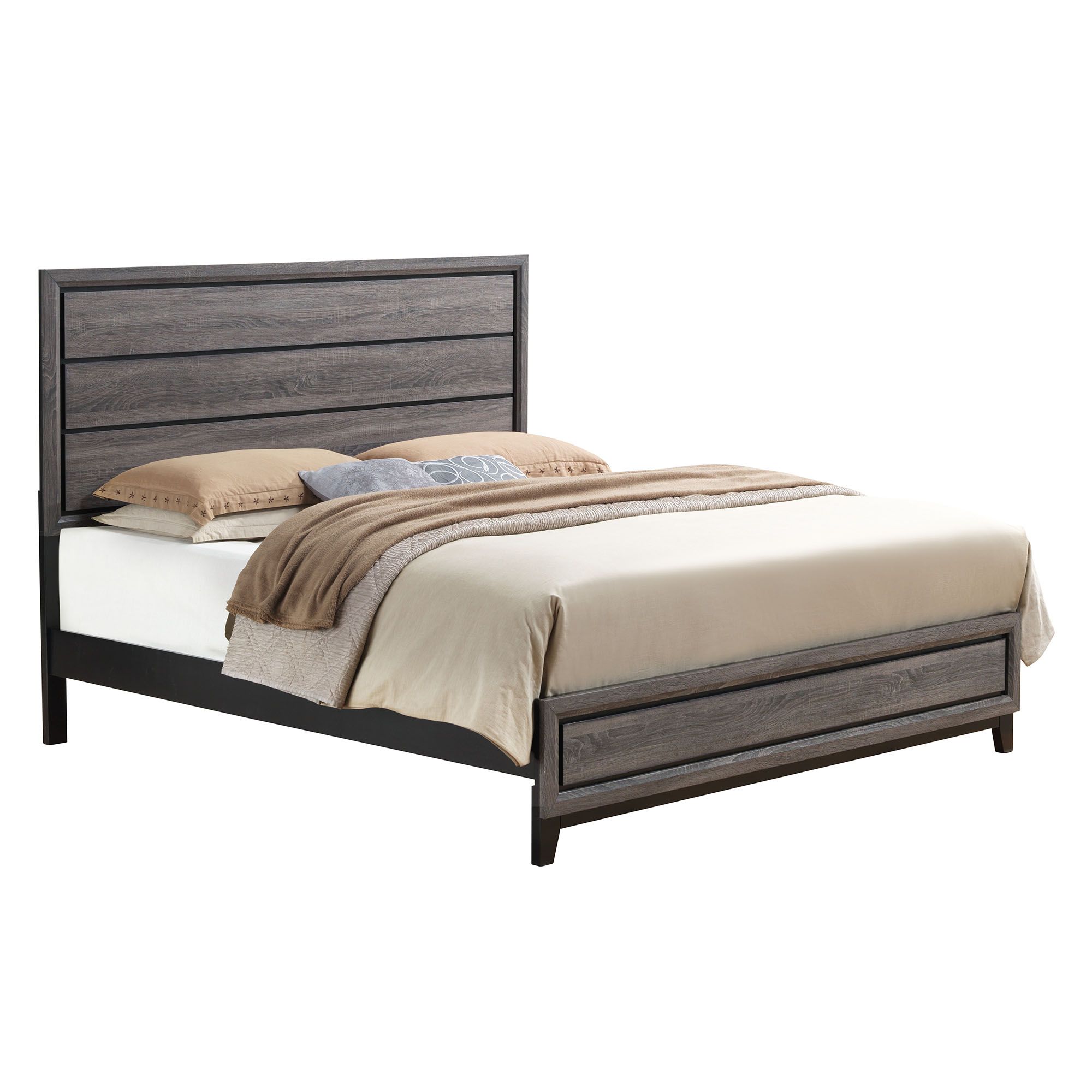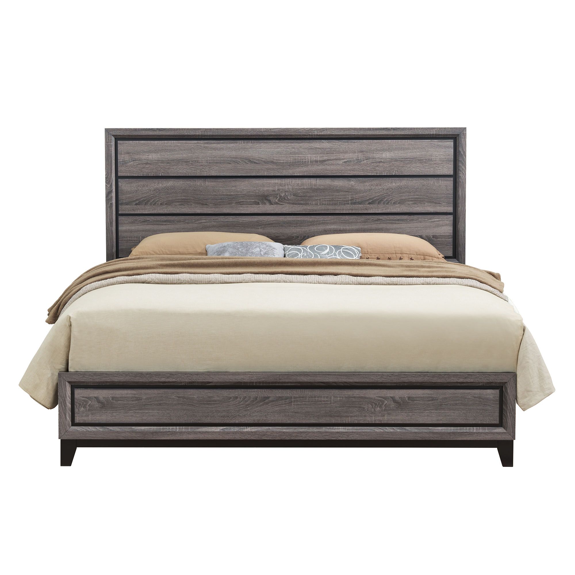 The clean, effortless lines and beechwood gray finish of the Kate 5-Pc. Bedroom Set brings modern elegance into your everyday. A plank style headboard with dark accent trim and a dark contrasting base pulls off the perfect balance you need for a timeless transitional look. Picture frame moldings compliment any bedroom setting.