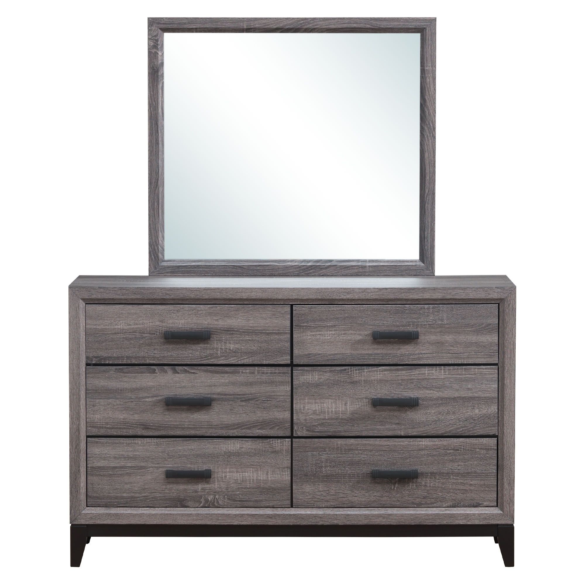 Rich beechwood gray finish Picture frame moldings Plank style headboard with dark accent trim English dovetail drawer construction Includes queen size bed, dresser with mirror, chest, and nightstand Warranty: 1 year