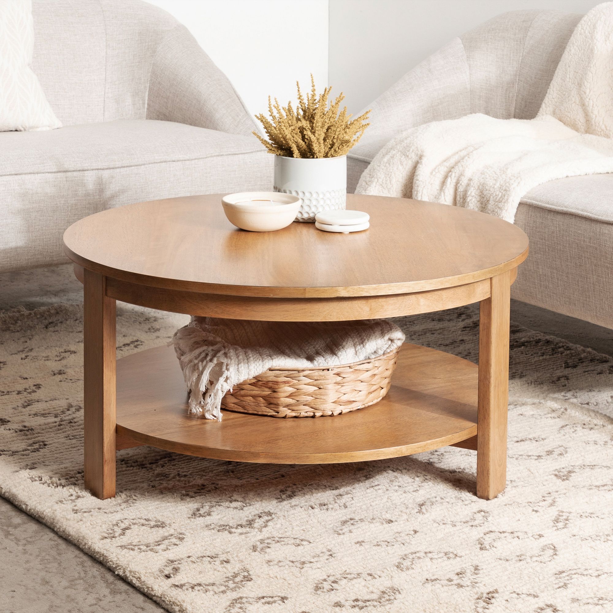 Showcase your transitional-inspired style with the Foxford coffee table from Kate and Laurel. The rich and elegant finish of the wood adds a touch of sophistication to any space, while the simple and clean lines of the design make it easy to blend seamlessly with any decor style. The natural brown finish also lends itself to organic modern design, giving it that look of transitional, timeless decor. A careful blend of solid wood and resilient wooden material was used to create this beautiful coffee table, creating a statement that is as durable as it is beautiful. Its overall dimensions are 34"D x 34"W x 17"H, allowing the Foxford to function well as a living room focal point. The top wooden tier is perfect for creating a lovely display area for candles, small lamps, and other accents. The bottom tier of the Foxford is great for storing your favorite household accessories, from blankets and pillows to everyday essentials. Assemble this table in only a matter of minutes with a straightforward, three-step assembly process.