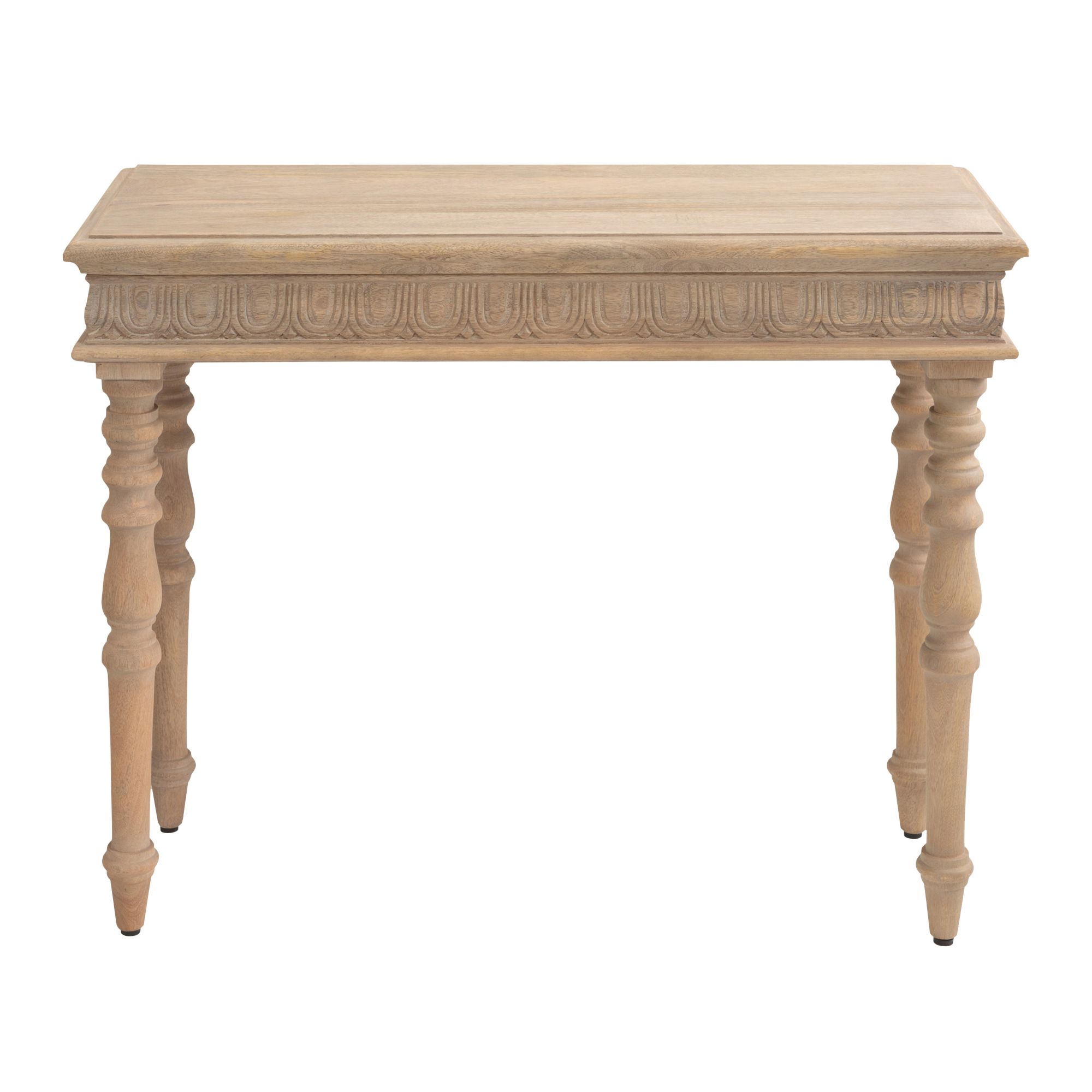 The exquisite Patresa console table is a masterpiece of craftsmanship, featuring intricate wooden carving details and beautifully turned legs that will instantly elevate the aesthetics of your living space. Crafted with care, the Patresa entryway table is a true testament to timeless design. Its traditional style complements a wide range of interior decor themes, from classic to contemporary, making it a versatile addition to any room. Whether you place it in your foyer, living room, hallway, or bedroom, this console table will enhance the charm of your home. Constructed from high-quality mango wood, this console table is built to last. The sturdy frame ensures stability, while the delicate carving details add a touch of sophistication. The natural finish lends an air of understated luxury, making it an ideal choice for those who appreciate refined aesthetics. This decorative rectangle entryway table not only serves as a stunning focal point but also offers practical storage space. The spacious tabletop provides ample room for displaying your favorite decorative items, family photos, or a stylish table lamp. The overall dimensions are 14"D x 36"W x 29.5"H. Assembly is a breeze, thanks to the two-step no-tools assembly process.