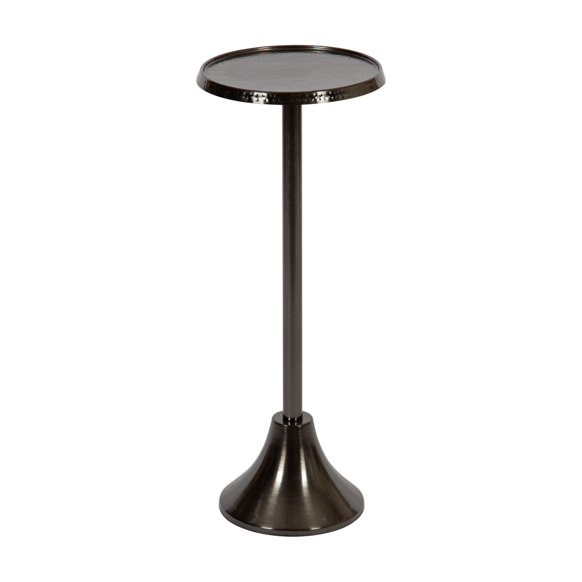 The charming Sanzo side table makes a bold impression with its handcrafted contemporary style. The Sanzo table has a sophisticated design that draws the eye and captures guests' attention, featuring a trendy round tabletop and a bell-shaped bottom. Each Sanzo offers a tactile texture on its surface, hammered by hand by skilled artisans in India. This craftsmanship creates a distinct look from piece to piece in this collection, allowing your end table to be completely one-of-a-kind. The table is made from an iron material featuring a lovely gunmetal finish to provide an iconic aesthetic that echoes eras of decorative refinement. This elegant end table's overall dimensions are 9" wide by 9" deep by 23" tall, making it a fantastic addition to a couch, armchair, ottoman, or bed. The Sanzo looks great, serving drinks on coasters, acting as a catch-all for small household items, or simply displaying your decorative style. The small size of this table makes it fantastic for small spaces or corners of the home. Assemble the beautiful Sanzo pedestal table in a matter of minutes with a simple two-step assembly process.