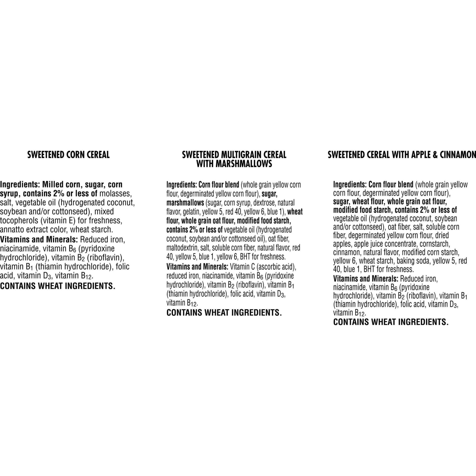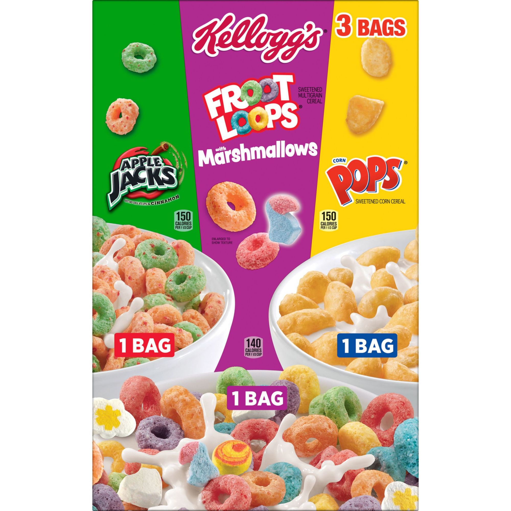 Includes one 37.3 oz. box containing three bags of ready-to-eat Kellogg's cereal Packaged for freshness and great taste Delicious breakfast cereal variety pack containing your choice of Apple Jacks, Corn Pops, and Froot Loops with Marshmallows Family-favorite cereals perfect for both kids and adults Yummy, sweetened, and crafted to help bring energy and smiles to busy mornings An excellent source of at least seven vitamins and minerals; A fun part of any balanced breakfast at home or on the go A travel-ready food Makes a tasty snack at work, afternoon pick me up at school, or late-night treat Stow in lunchboxes, totes, and backpacks