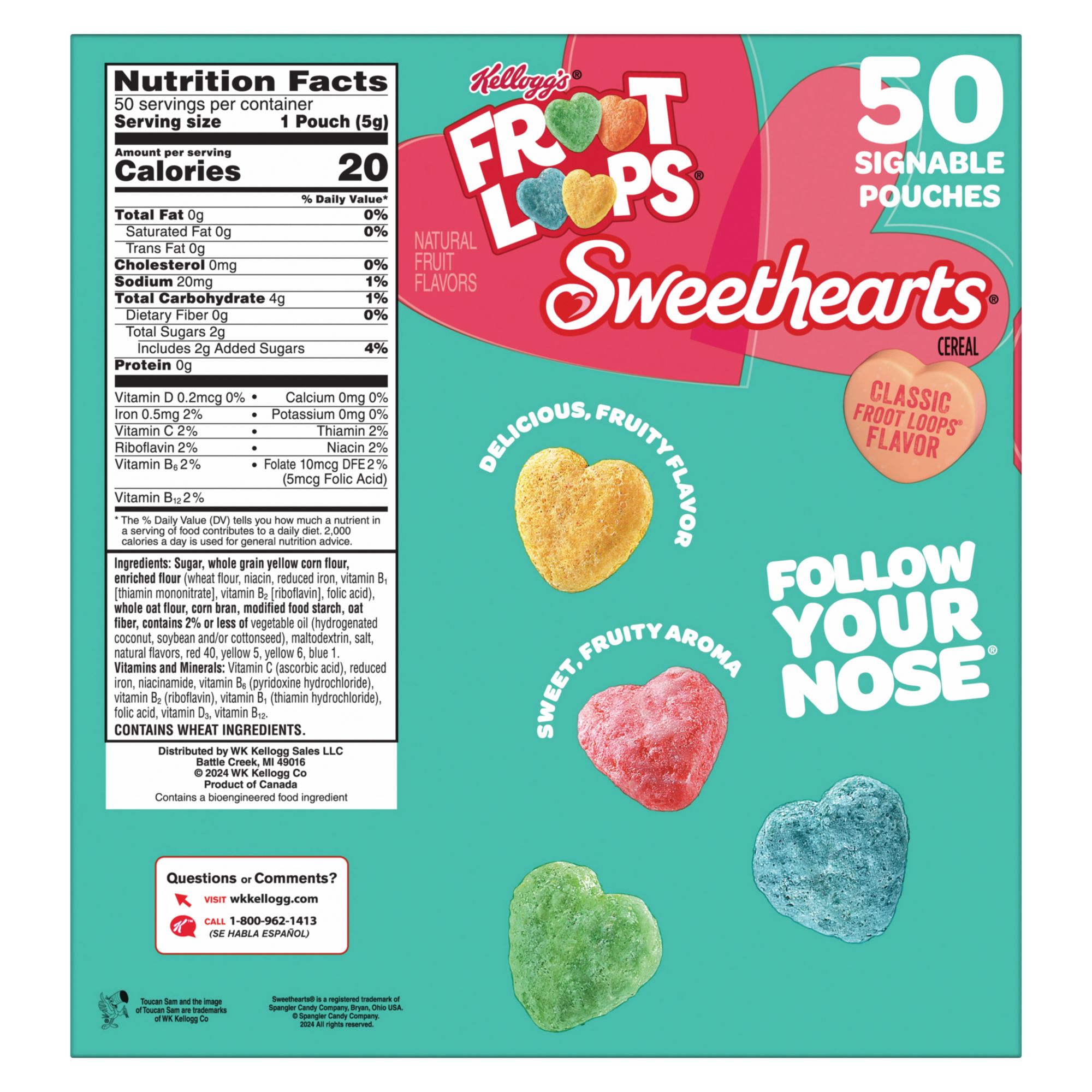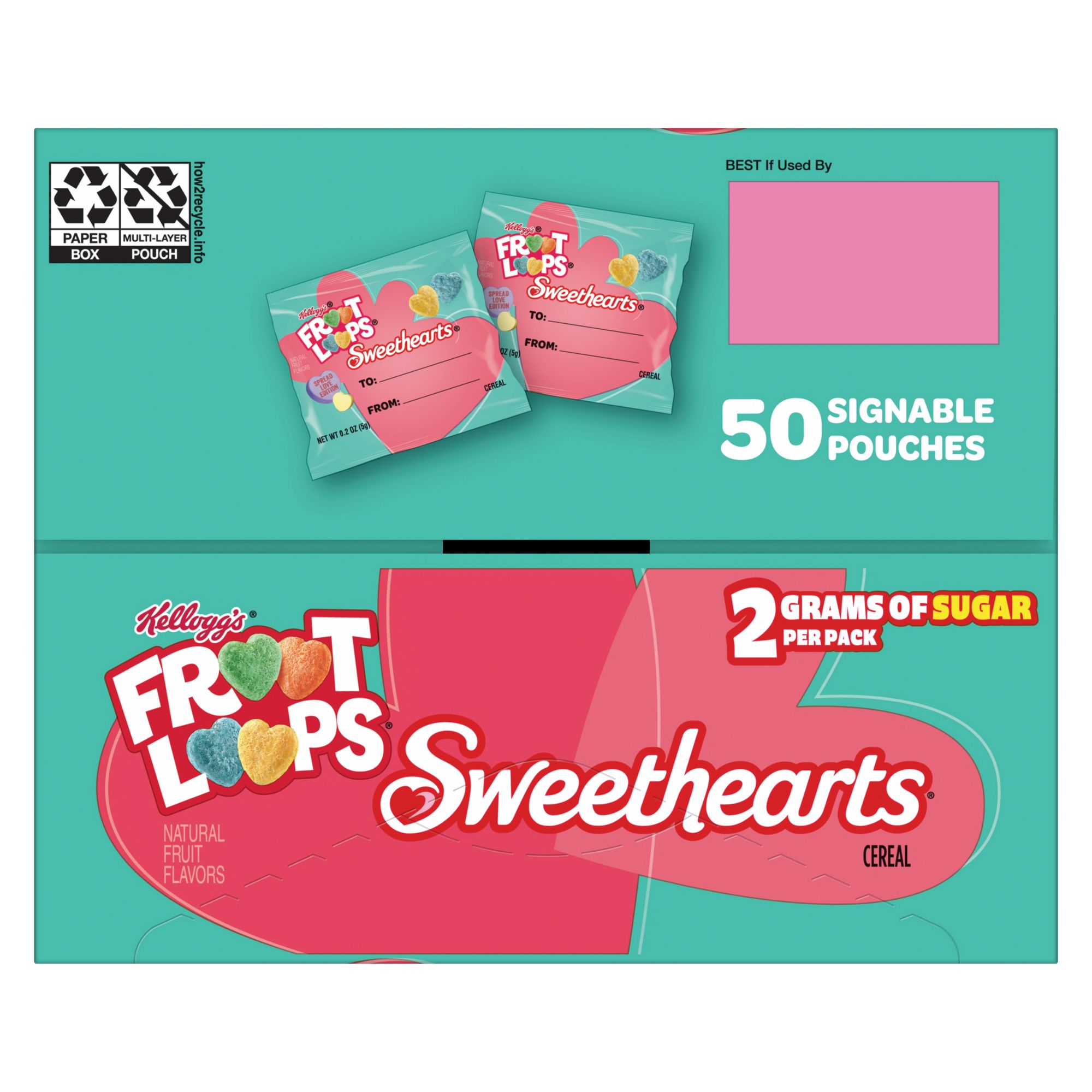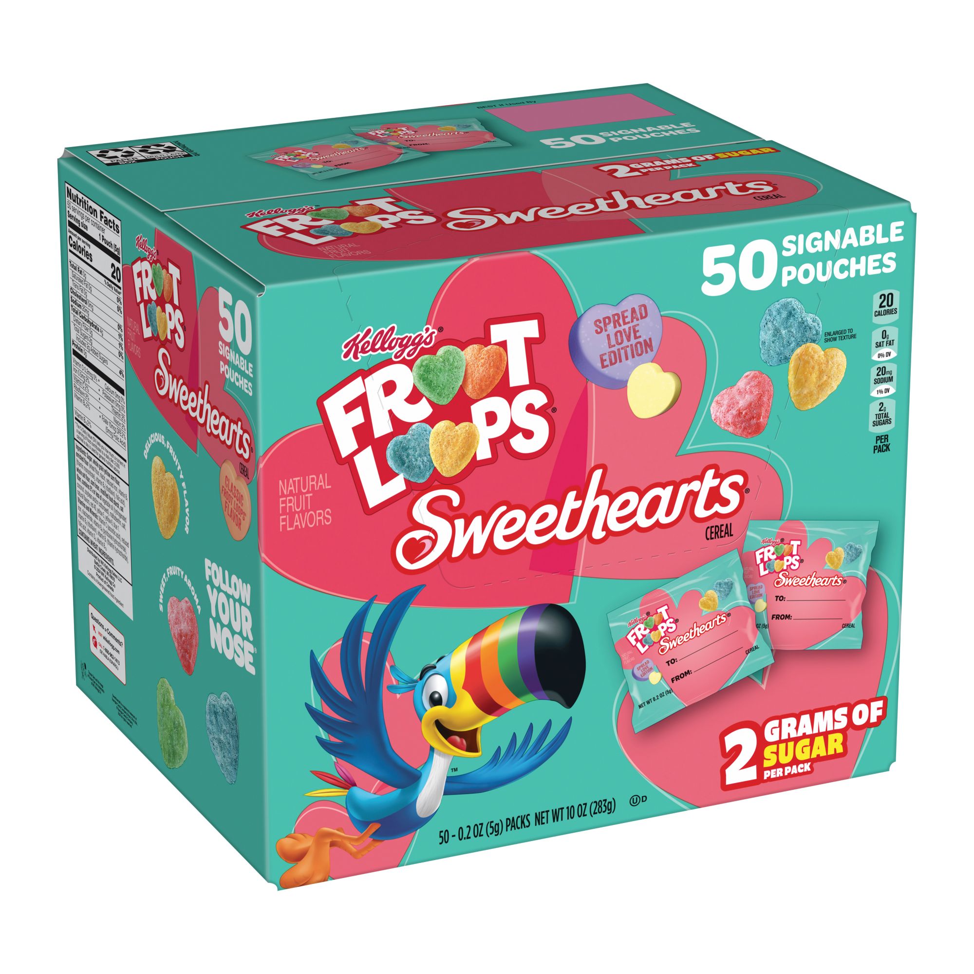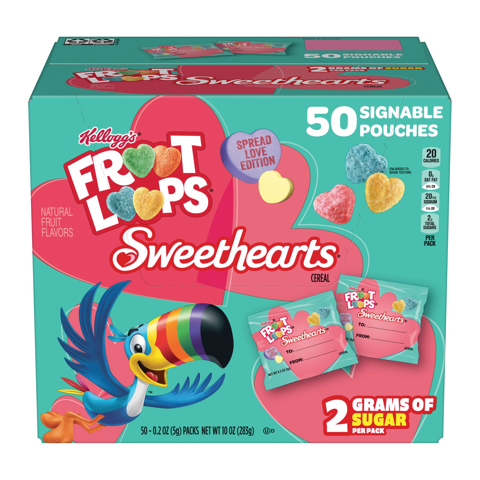 Includes one, 10 oz. box containing 50 pouches of Kellogg's Froot Loops Sweethearts cereal snacks; Packaged for freshness and great taste