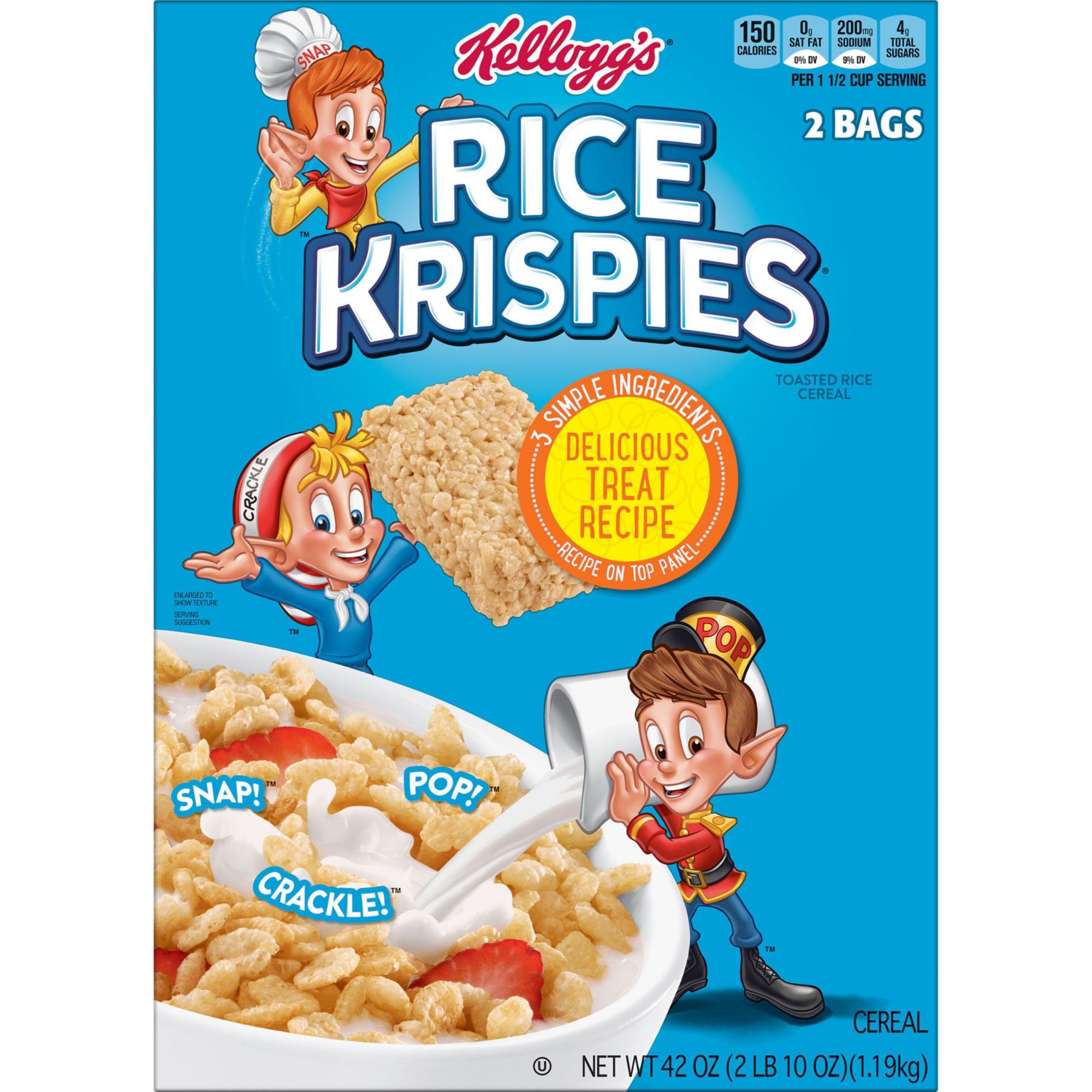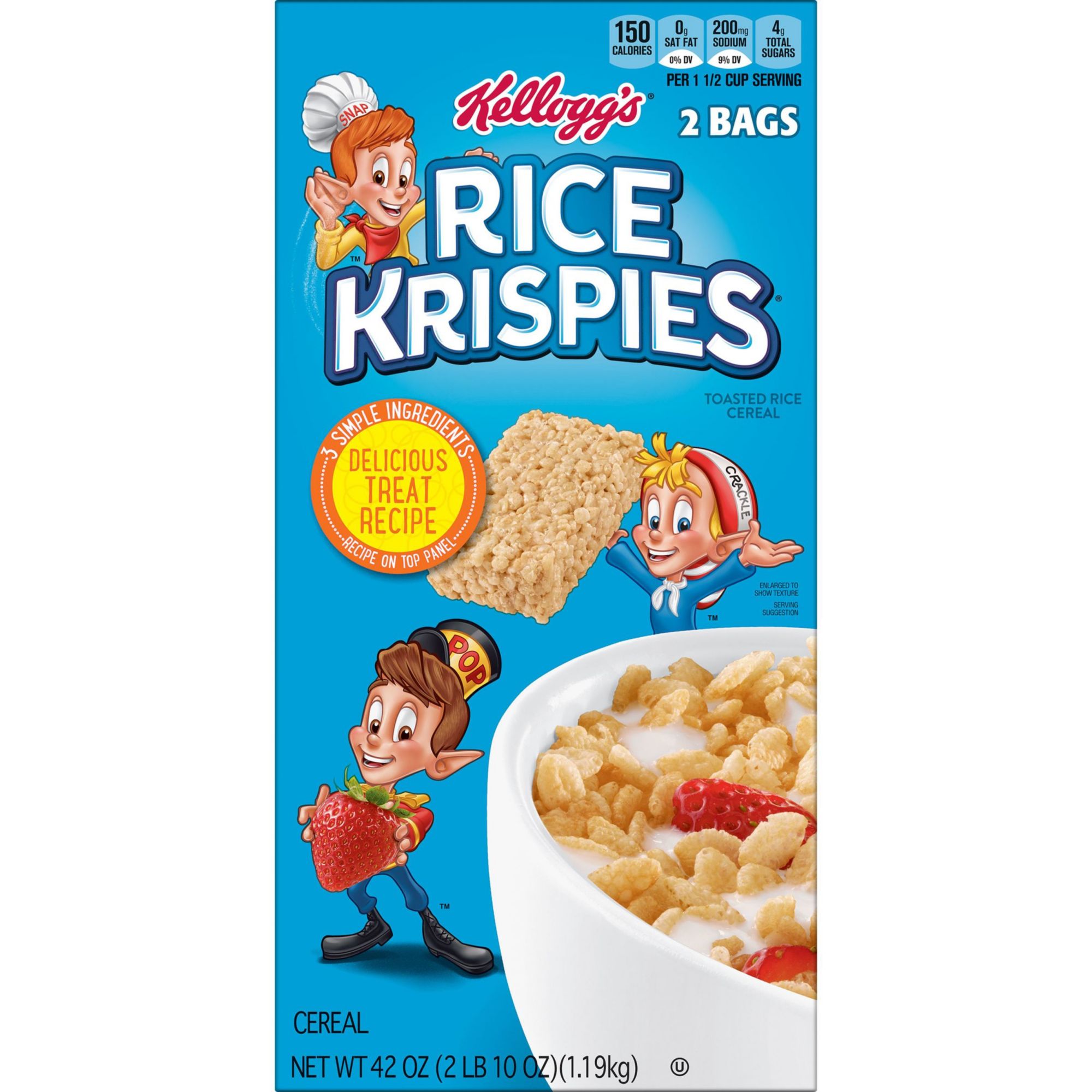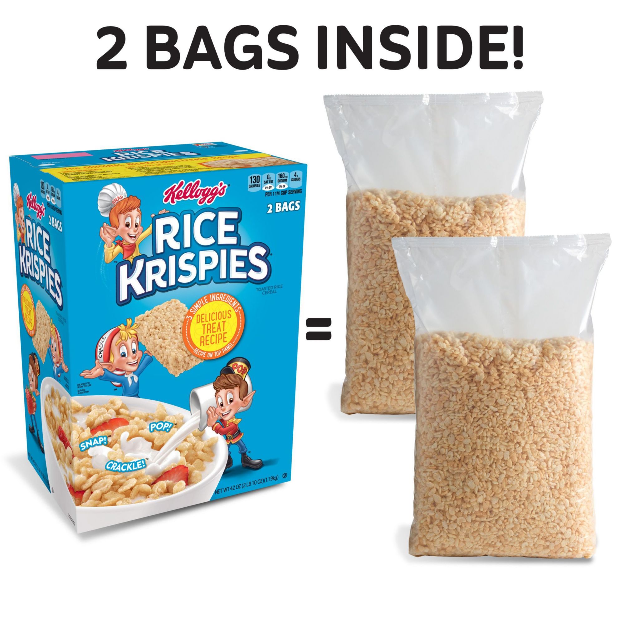 Includes 1, 42-ounce box of ready-to-eat Kellogg's Rice Krispies cereal containing 2 bags; Packaged for freshness and great taste A classic, family-favorite cereal, perfect for breakfast and treat-making Enjoy with your favorite milk or as part of The Original Treats recipe A crisp way to start your day, Rice Krispies brings the classic crunch of puffed, oven-toasted rice cereal in every bite A healthy, fat-free cereal with an excellent source of 7 vitamins and minerals in every serving; Kosher Pareve A travel-ready food