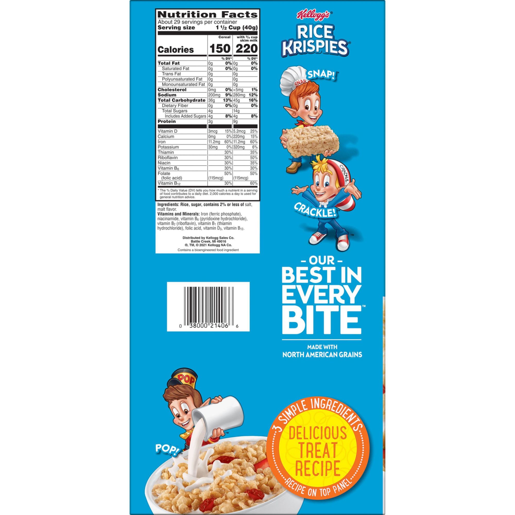 Whether you're enjoying it by the bowlful or through the delicious taste of The Original Treats recipe, Kellogg's Rice Krispies cereal makes it easy to bring a little magic to your day. Made with crispy oven-toasted puffed rice cereal, Rice Krispies are a satisfying and healthy way to start your day. A good source of 8 vitamins and minerals, Rice Krispies are also fat-free. Crafted to help bring energy to your mornings, our crispy cold cereal also makes for a sweet pick-me-up as an afternoon bite, or late night treat. Just add your favorite dairy or nut-milk or enjoy as a crispy treat straight from the box. Decorate your bowl with strawberries, bananas, chocolate chips or your favorite toppings. Whip up a tasty batch of memories with your family by making The Original Treats recipe together. All you need are three simple ingredients: butter, marshmallows and Rice Krispies cereal. The possibilities are endless with Kellogg's Rice Krispies cereal.