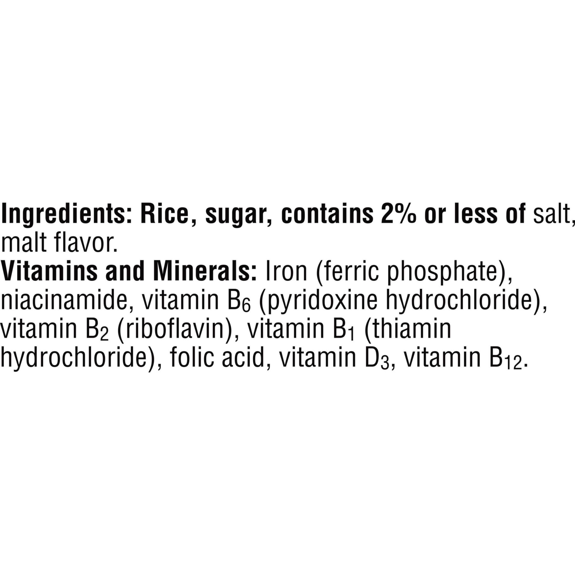 Ingredients: Rice, Sugar, contains 2% or less of salt, malt flavor. Vitamins and Minerals
