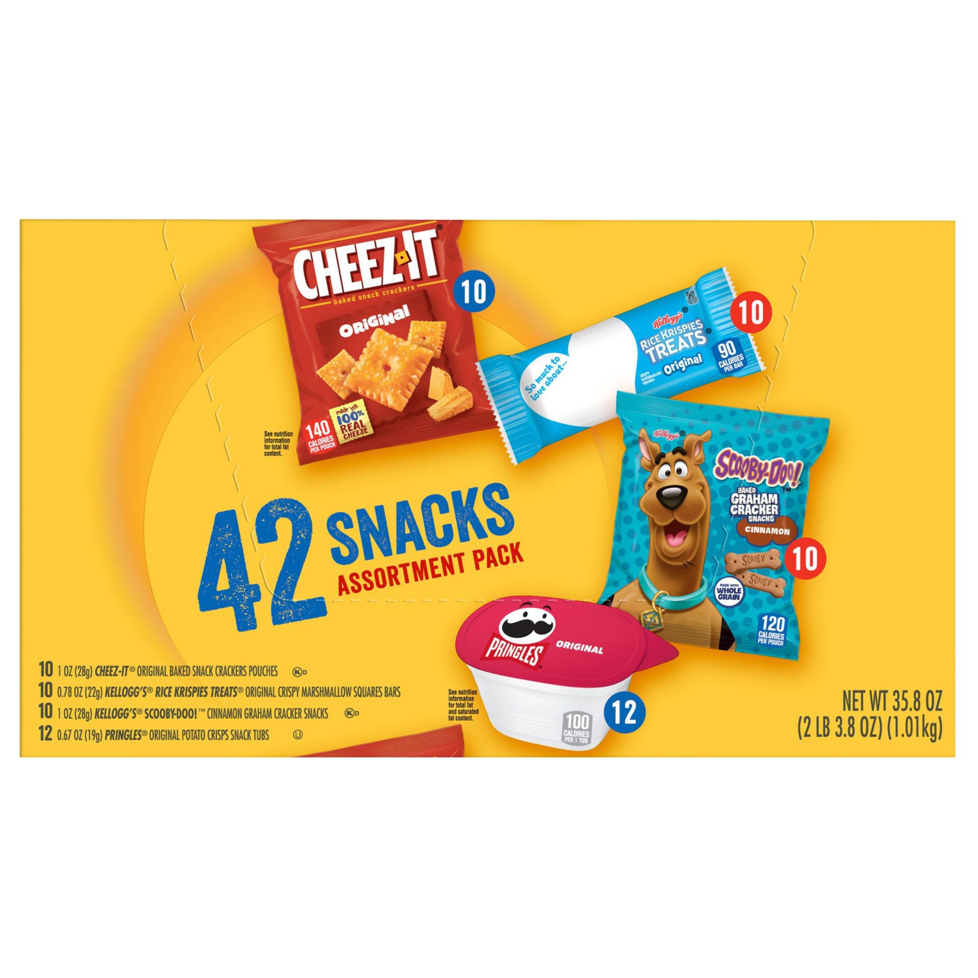 Make snack time easier and more fun with the Kellogg's Snacking Assortment Pack and your choice of four tasty snacks. This pack includes Cheez-It Original Baked Snack Crackers, Pringles Original Potato Crisps, Rice Krispies Originals, and Scooby-Doo Baked Graham Cracker Snacks Cinnamon. All of these delicious snacks arrive conveniently contained in single-serving pouches or containers within one, Grab-and-Go box. Whether they're into savory, sweet, or salty, everybody in your family is sure to have a favorite from this selection of classic snacks. These individually-wrapped snacks make great fillers for goodie bags, gift baskets, or care packages. Bring a pouch or snack stack along for the perfect snack at school, lunchtime, the office, while traveling, at the game, and more. Stock your pantry with the Kellogg's Snacking Assortment Pack for easy snacks whenever you need them.