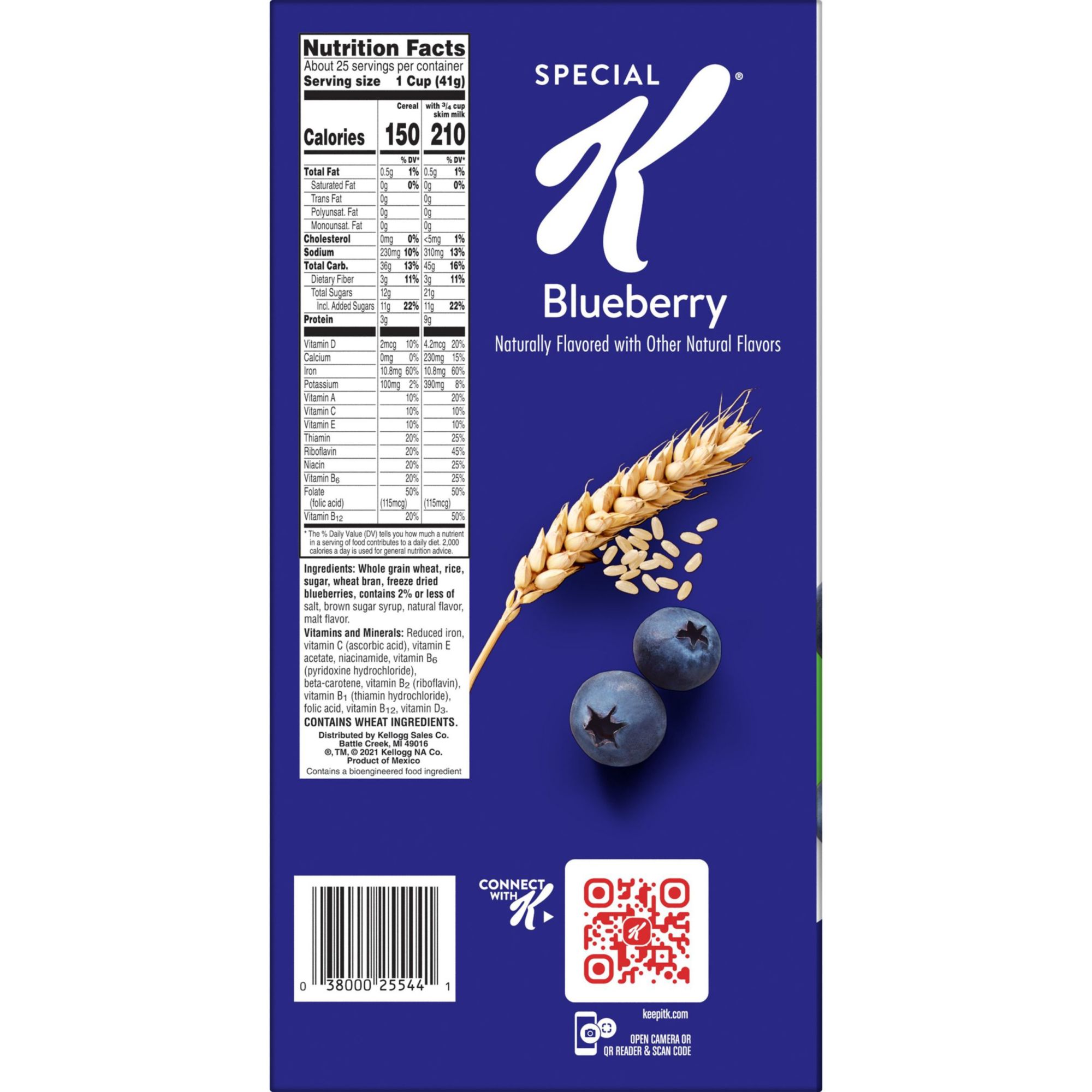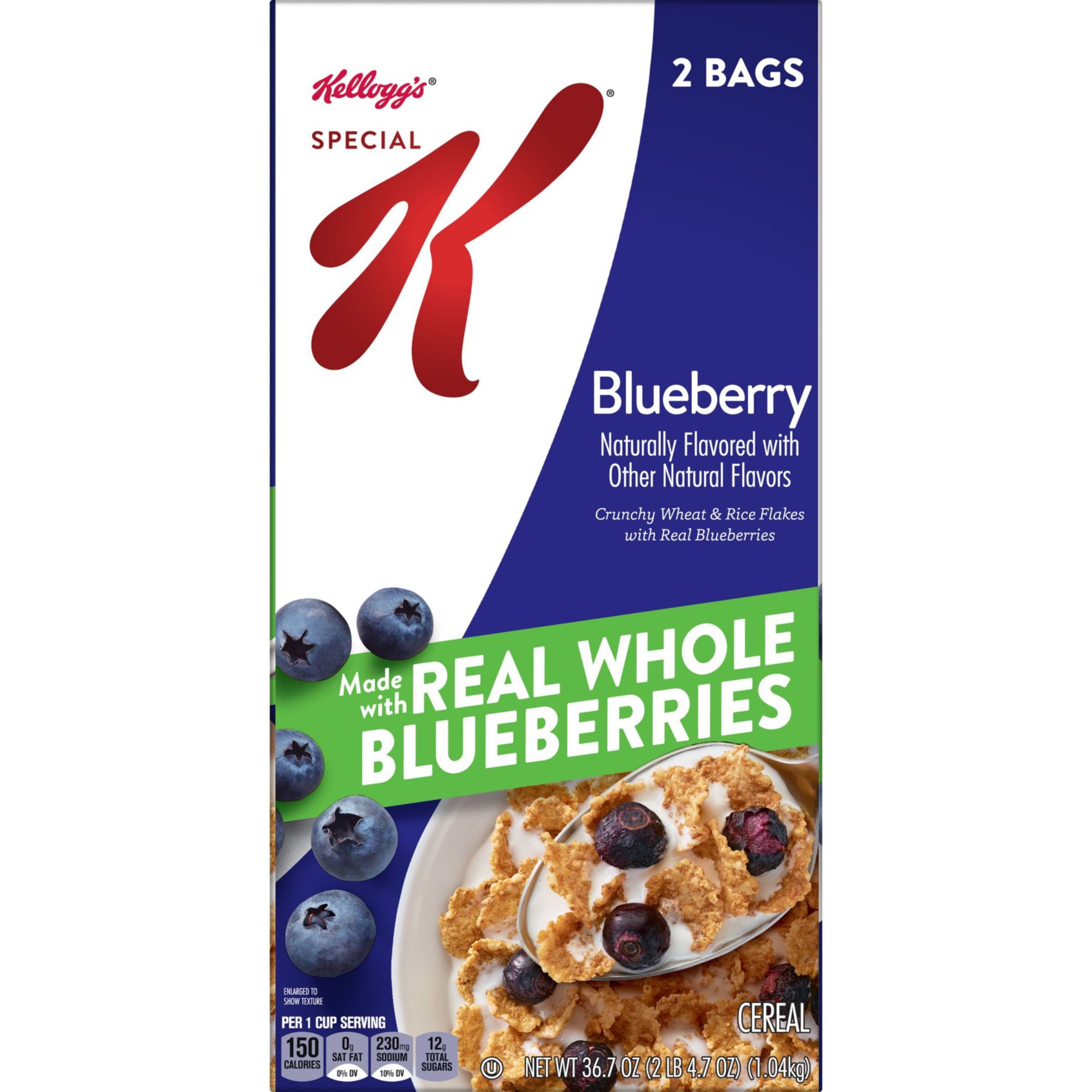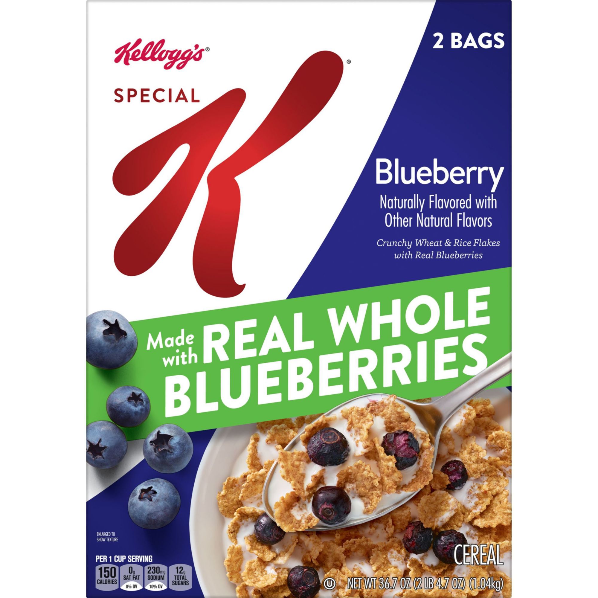 Do what's delicious with Special K Blueberry, a wholesome cereal that makes your morning a little brighter with each irresistible spoonful. This cereal is a satisfying mix of crunchy wheat and rice flakes with real whole blueberries to help you stay on track for the day ahead. Just as nutritious as it is delicious, this breakfast cereal is a good source of 11 vitamins and minerals and contains 15g of whole grains per serving. Special K Blueberry cereal is a tasty addition to a meal or snack any time. Enjoy as a simple pick-me-up during your work day or after a workout. Make it your go-to for a mid-afternoon or late-night snack. Special K Blueberry can also be added to your favorite yogurt and is a great base for homemade trail mix; the options are endless. Whether you enjoy a bowlful at breakfast time or any time, Kellogg's Special K Blueberry cereal lets you own your day with each delicious bite.