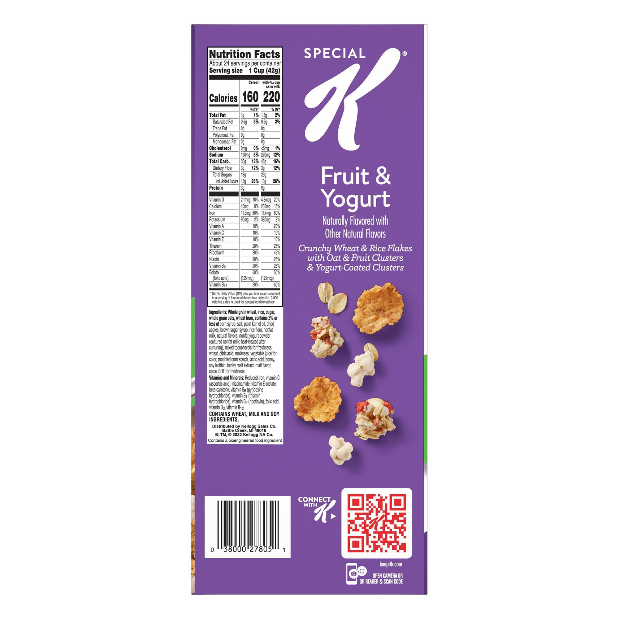 Do what's delicious, with Special K Fruit and Yogurt. Crisp rice and wheat flakes with clusters of oats, fruit, and yogurt can help you stay on track for the day ahead. Nutritious and delicious, every bowl provides a good source of 11 vitamins and minerals. This cereal is made with fiber, B vitamins, and iron, plus Vitamins A, C, and E. Colors and flavors are from natural sources. Make it an irresistible, low-fat part of your lunch, dinner or late-night snack. Try it as a convenient work day or between-meal treat. Enjoy Special K with dairy or nut-milk. Add it to your favorite yogurt, smoothie, or trail mix recipe. Morning time or any time, Kellogg's Special K Fruit and Yogurt cereal is a flavorful choice the whole family can feel good about.