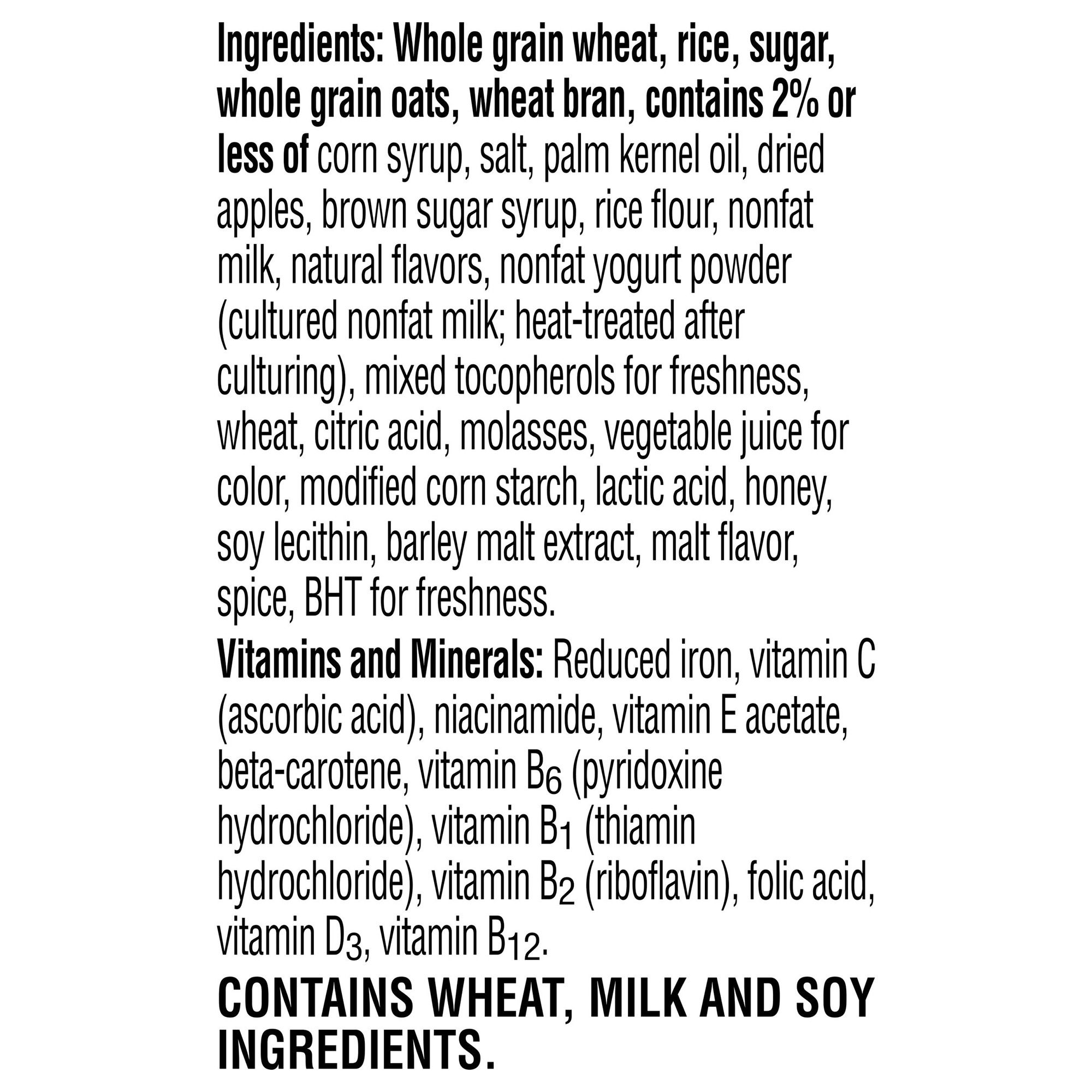 Ingredients: Whole Grain Wheat, Rice, Sugar, Whole Grain Oats, Wheat Bran, Contains 2% Or Less Of Corn Syrup, Salt, Palm Kernel Oil, Dried Apples, Brown Sugar Syrup, Rice Flour, Nonfat Milk, Natural Flavors, Nonfat Yogurt Powder (Cultured Nonfat Milk; Heat-treated After Culturing), Mixed Tocopherols For Freshness, Wheat, Citric Acid, Molasses, Vegetable Juice For Color, Modified Corn Starch, Lact.ic Acid, Honey, Soy Lecithin, Barley Malt Extract., Malt Flavor, Spice, BHT For Freshness. Vitamins And Minerals: Reduced Iron, Vitamin C (Ascorbic Acid), Niacinamide, Vitamin E Acetate, Beta-carotene, Vitamin B6 (Pyridoxine Hydrochloride), Vitamin B1 (Thiamin Hydrochloride), Vitamin B2 (Riboflavin), Folic Acid, Vitamin D3, Vitamin B12.