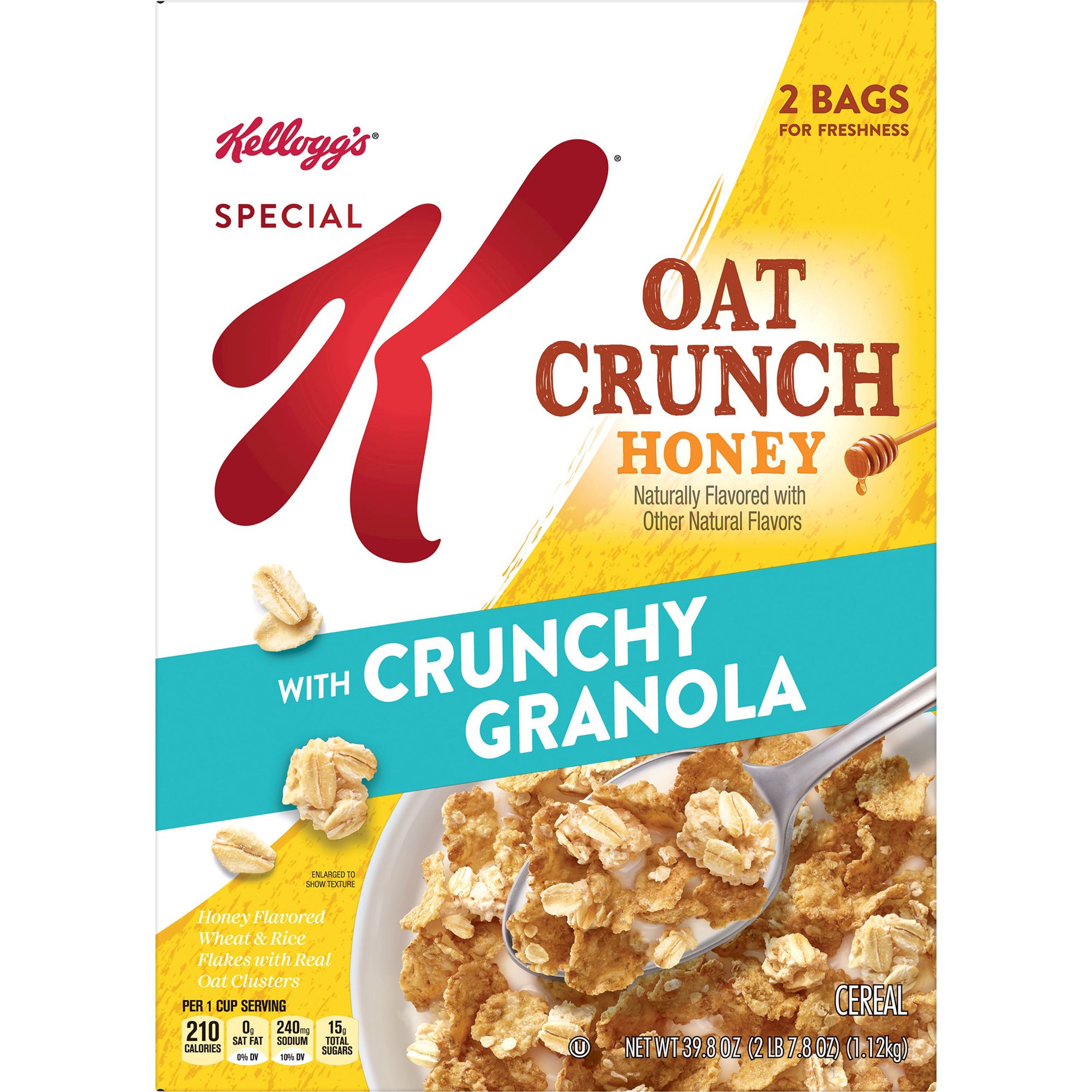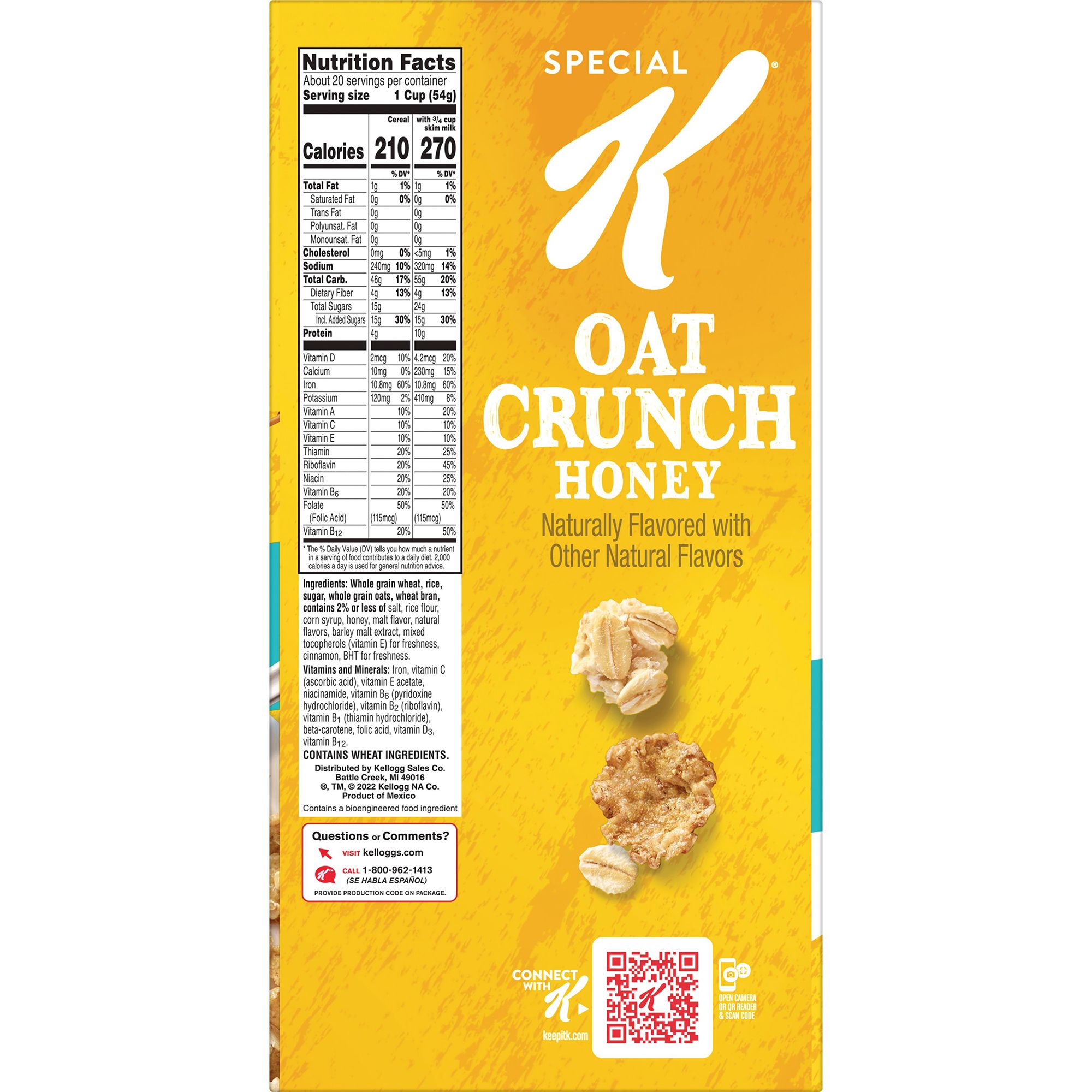 Wake up to the delicious crunchiness of Kellogg's Special K Oat Crunch Honey Breakfast Cereal. A cereal with a crave-worthy combination of toasted wheat and rice flakes, delightful taste of honey, and flavorful vanilla oat clusters. Each serving is a good source of 11 vitamins and minerals, plus a good source of fiber. Enjoy this pantry staple with your favorite dairy or nut milk; Have a bowl as a mid-day snack or late-night bite. Sprinkle this crispy cereal over yogurt for added texture. No matter how you enjoy it, Special K Oat Crunch Honey makes it easy for adults and kids to do what’s delicious, anytime.
