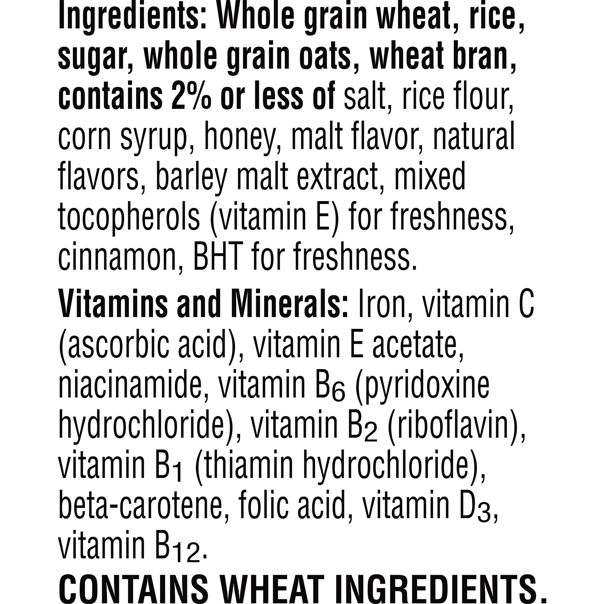 Ingredients: Whole Grain Wheat, Rice, Sugar, Whole Grain Oats, Wheat Bran, Contains 2% Or Less Of Salt, Rice Flour, Corn Syrup, Honey, Malt Flavor, Natural Flavors, Barley Malt Extract, Mixed Tocopherols (Vitamin E) For Freshness, Cinnamon, BHT For Freshness. Contains Iron, Vitamin C (Ascorbic Acid), Vitamin E Acetate, Niacinamide, Vitamin B6 (Pyridoxine Hydrochloride), Vitamin B2 (Riboflavin), Vitamin B1 (Thiamin Hydrochloride), Beta-Carotene, Folic Acid, Vitamin D3, Vitamin B12.