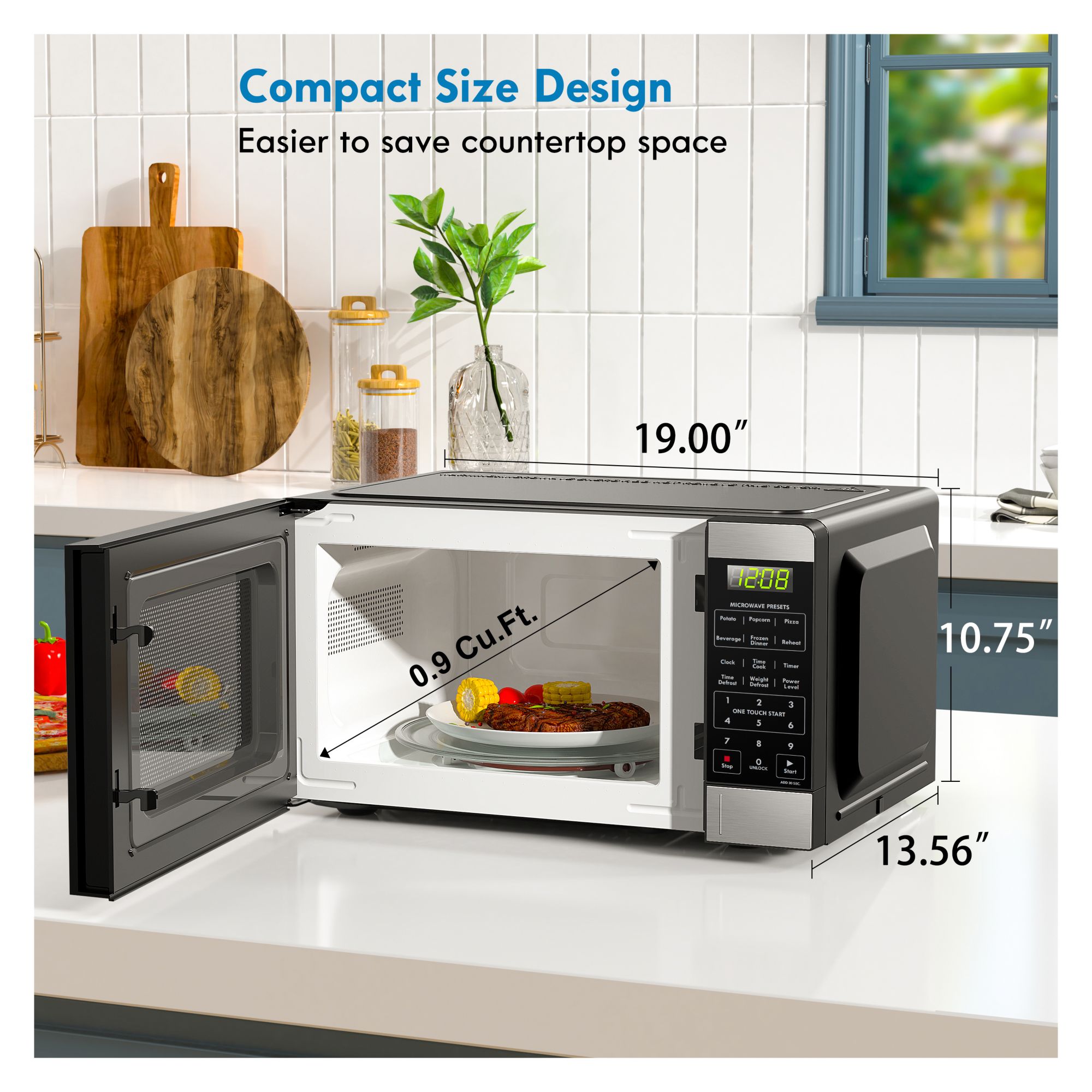 0.9 cu.-ft. capacity Six preset cooking menus Stainless steel finish Easy to read digital LED display 10 power levels Timer and quick start Interior light Includes microwave, glass turning table, roller ring, owner's manual