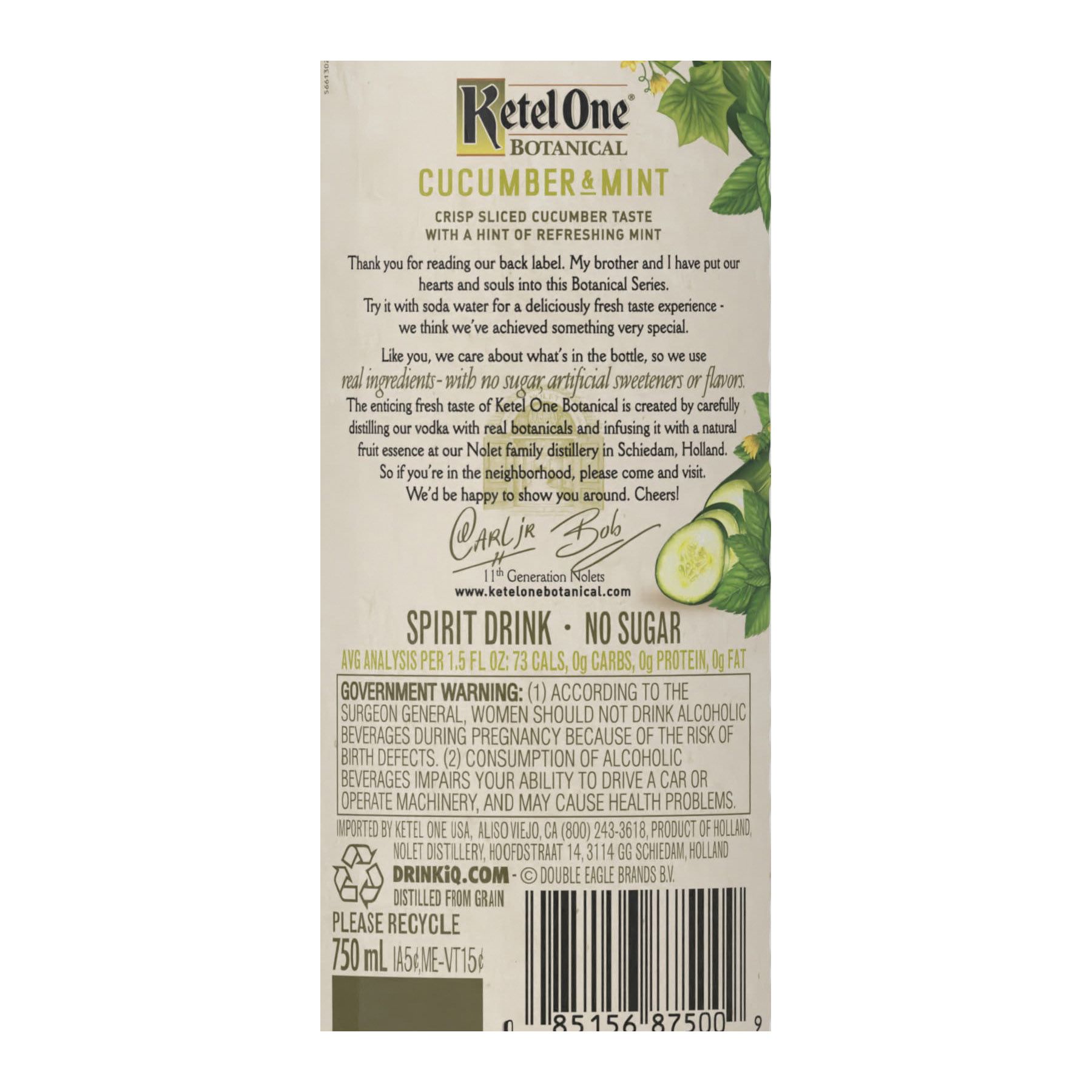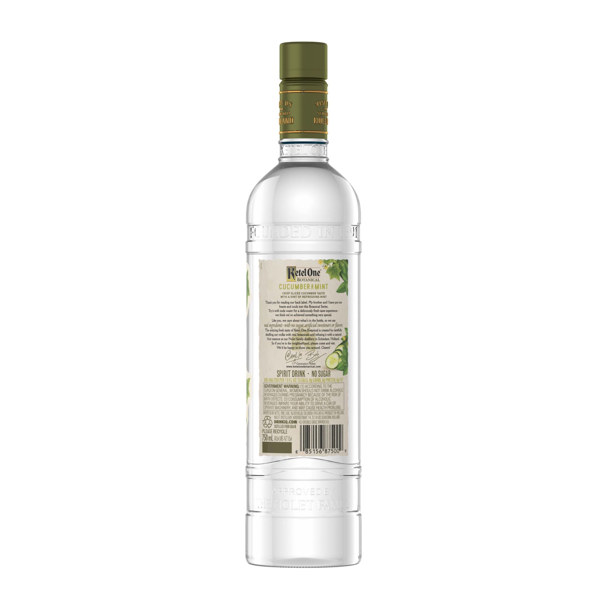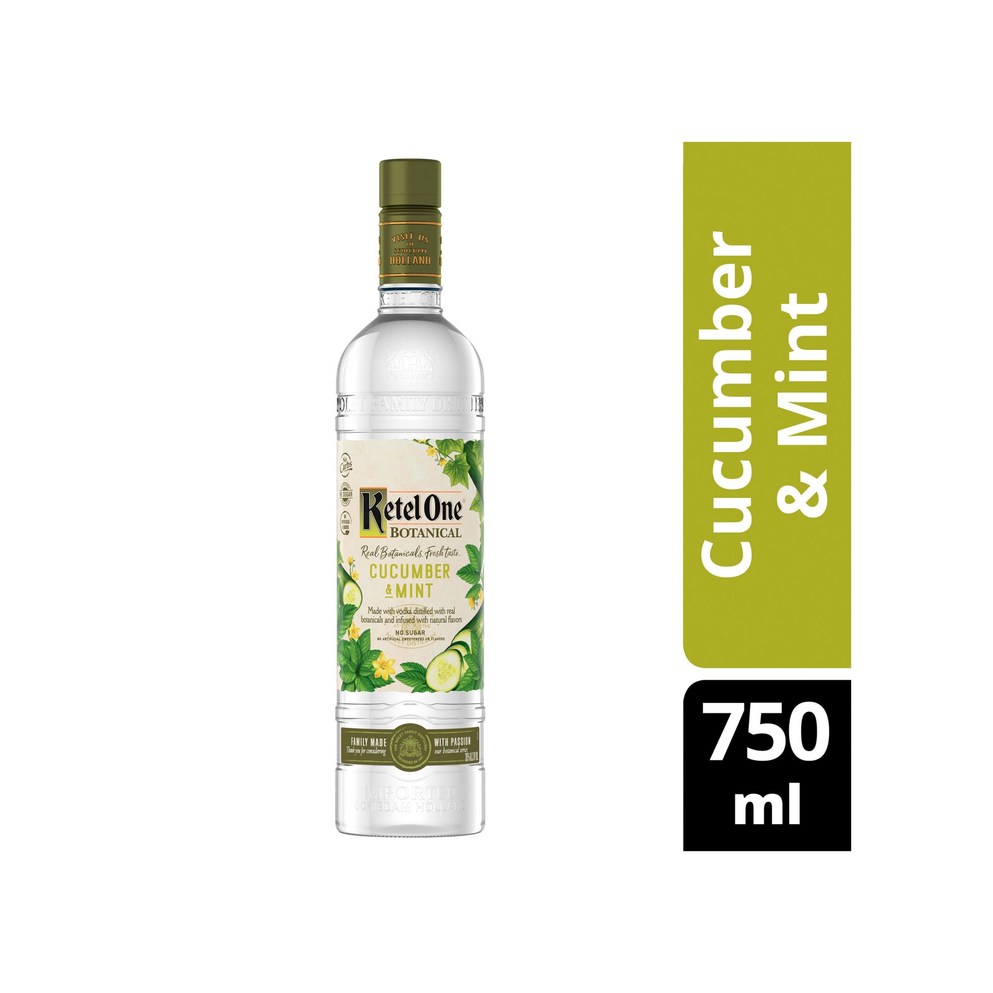 Ketel One Botanical Cucumber & Mint is for those who appreciate crisp cucumbers and light tones of fresh garden mint. Each botanical essence is individually and naturally obtained through innovative extraction methods and distillation processes for the freshest, cleanest, most crisp taste possible. With no carbs, artificial flavors, sweeteners or sugar*, our vodka is the mindful way to celebrate the weekend or relax with friends. Perfect for any vodka soda. Includes one 750 mL bottle of 60 proof Ketel One Botanical Cucumber & Mint. Please drink responsibly. *Avg. analysis per 1.5 oz.: 73 cal; 0g carbs; 0g protein; 0g fat.