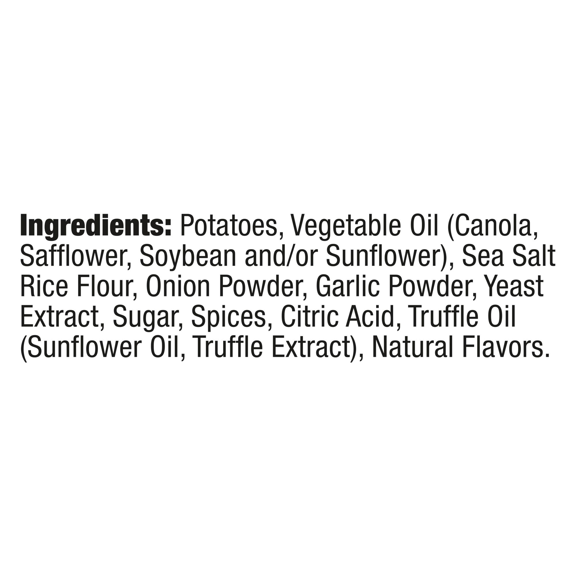 Ingredients: Potatoes, Vegetable Oil (Canola, Safflower, Soybean And/or Sunflower), Sea Salt, Rice Flour, Onion Powder, Garlic Powder, Yeast Extract, Sugar, Spices, Citric Acid, Truffle Oil (Sunflower Oil, Truffle Extract), Natural Flavors.
