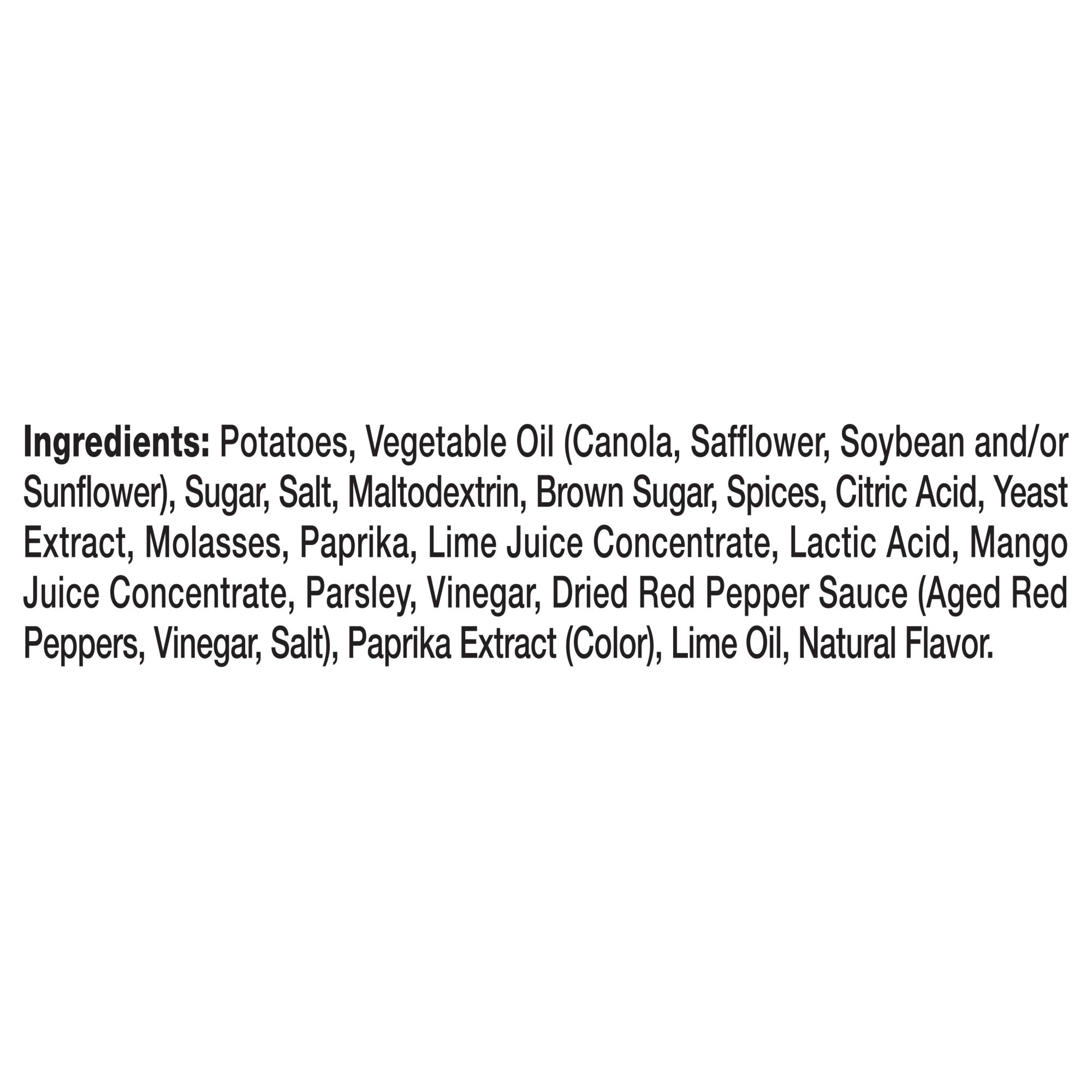 Ingredients: Potatoes, Vegetable Oil (Canola, Safflower, Soybean And/or Sunflower), Sugar, Salt, Maltodextrin, Brown Sugar, Spices, Citric Acid, Yeast Extract, Molasses, Paprika, Lime Juice Concentrate, Lactic Acid, Mango Juice Concentrate, Parsley, Vinegar, Dried Red Pepper Sauce (Aged Red Peppers, Vinegar, Salt), Paprika Extract (Color), Lime Oil, Natural Flavor.